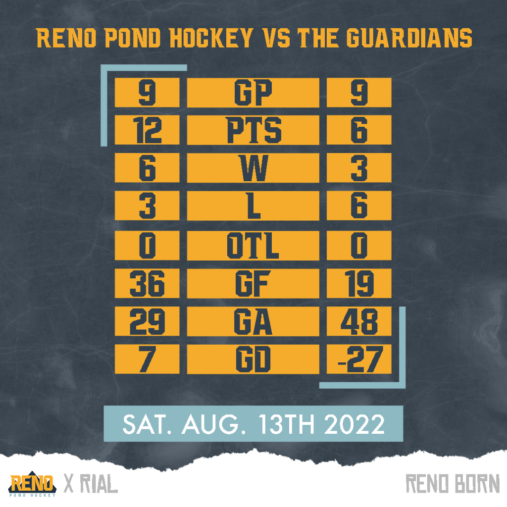 Reno Pond Hockey is coming off of a 5-1 win against Mid-Ice Crisis. Reno Pond Hockey is on a three game winning streak. Reno Pond Hockey is 6-3-0. Reno Pond Hockey sits in 2nd place in the current D-League standings. The Guardians are coming off of a 3-2 win against The Grrrowlers. The Guardians are 3-6-0. The Guardians are currently in 4th place in the D-League standings. The all time record between Reno Pond Hockey and The Guardians is 1-0-0. Reno Pond Hockey last played The Guardians on July 6th, 2022. That game ended in a 6-1 Reno Pond Hockey victory.