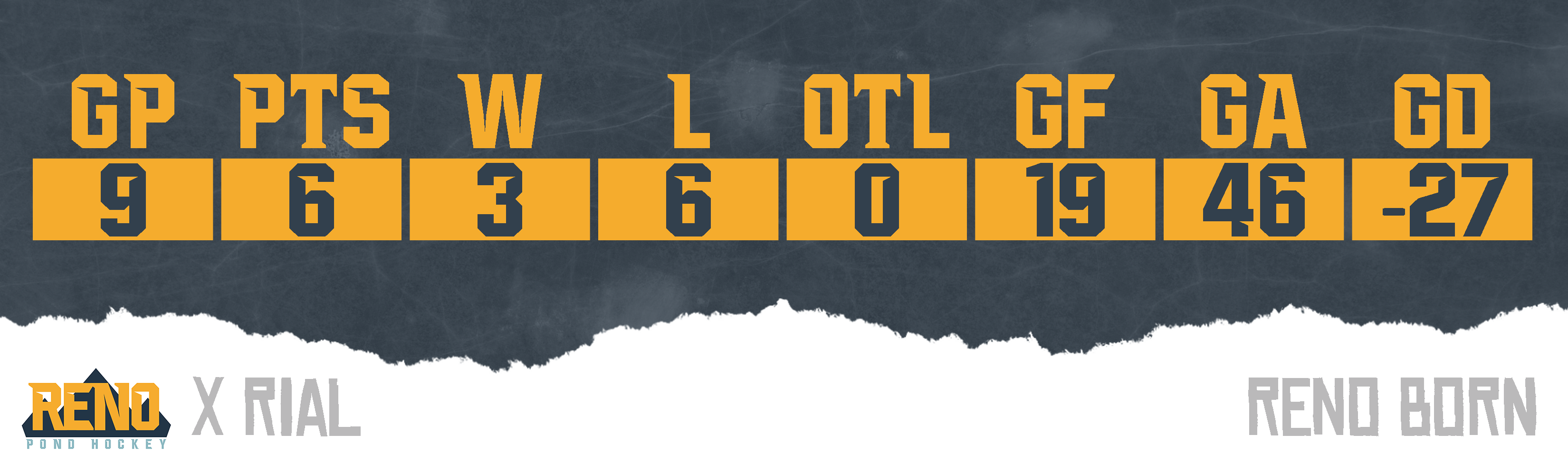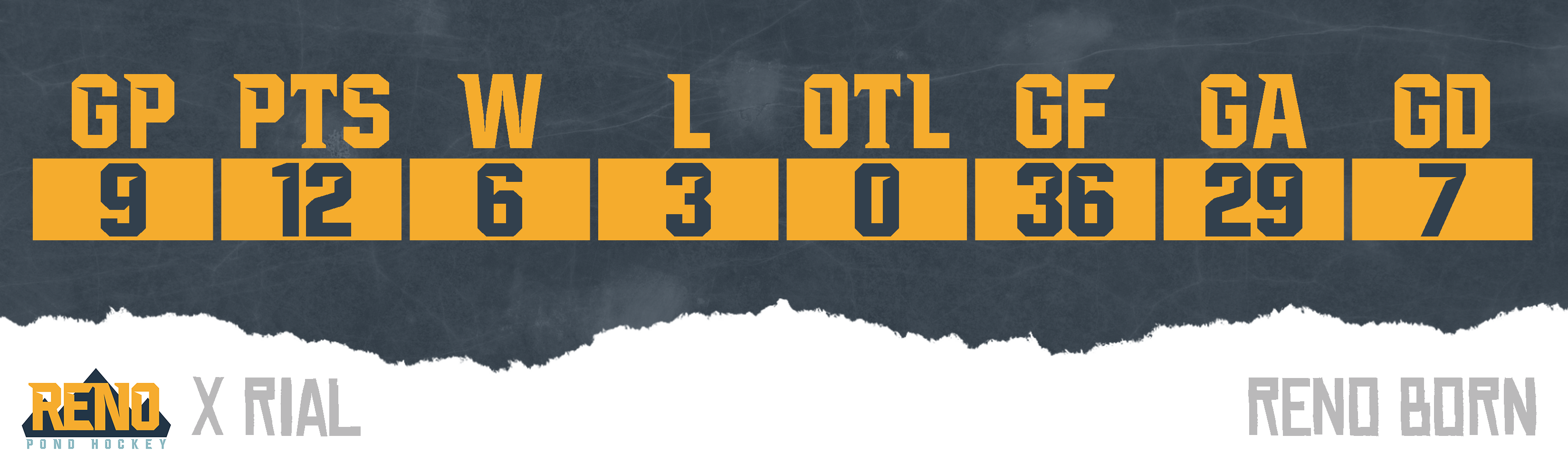 Reno Pond Hockey has allowed 29 goals after eight games. That is 3.22 goals against per game. That is currently 2nd least in the league. Reno Pond Hockey has a 7 goal differential.