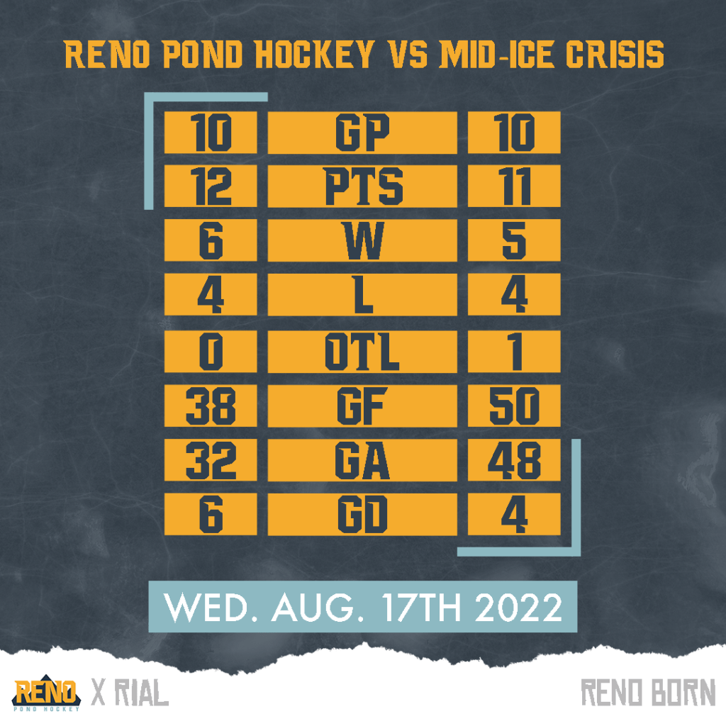 Reno Pond Hockey is coming off of a 2-3 loss to The Guardians. Reno Pond Hockey finished the regular season 6-4-0. Reno Pond Hockey won 2nd place in the regular season standings. Reno Pond Hockey is the number 2 seed in the D-League Playoffs. Mid-Ice Crisis are coming off of a 1-8 loss against the Slappy Gilmores. Mid-Ice Crisis lost back to back games to end the regular season. Mid-Ice Crisis finished the regular season 5-4-1. Mid-Ice Crisis won 3rd place in the regular season standings. The all time record between Reno Pond Hockey and Mid-Ice Crisis is 2-1-0. Reno Pond Hockey last played Mid-Ice Crisis on August 3rd, 2022. That game ended in a 5-1 Reno Pond Hockey victory.