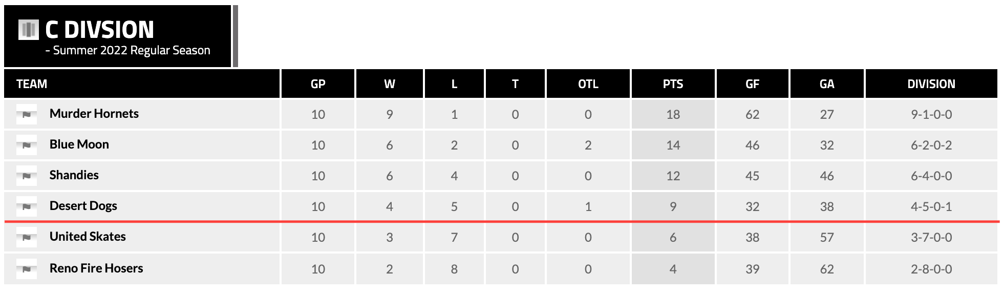 Eliminated From Playoffs: Dough Boys (DNQ), Grrrowlers (DNQ), The Guardians (Semi-Finals), Mid-Ice Crisis (Semi-Finals)