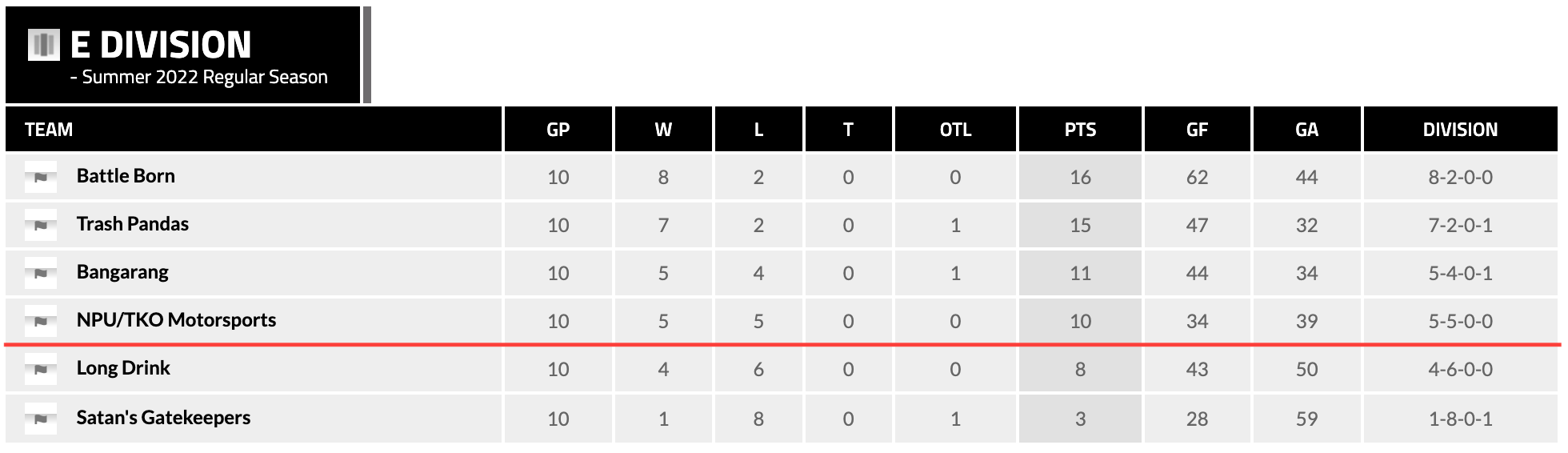 Battle Born won the E-League regular season title and the number 1 seed. Trash Pandas won second place and are the number 2 seed. Bangarang are the number 3 seed. NPU/TKO Motorsports are the number 4 seed. Satans Gatekeepers and Long Drink were eliminated from playoff contention.