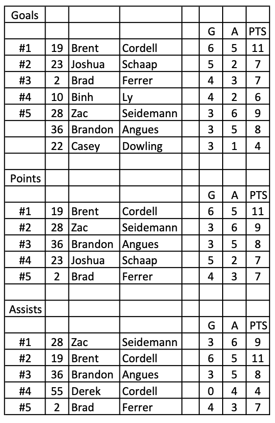 Here are Reno Pond Hockey’s goals, points, and assist leaders: