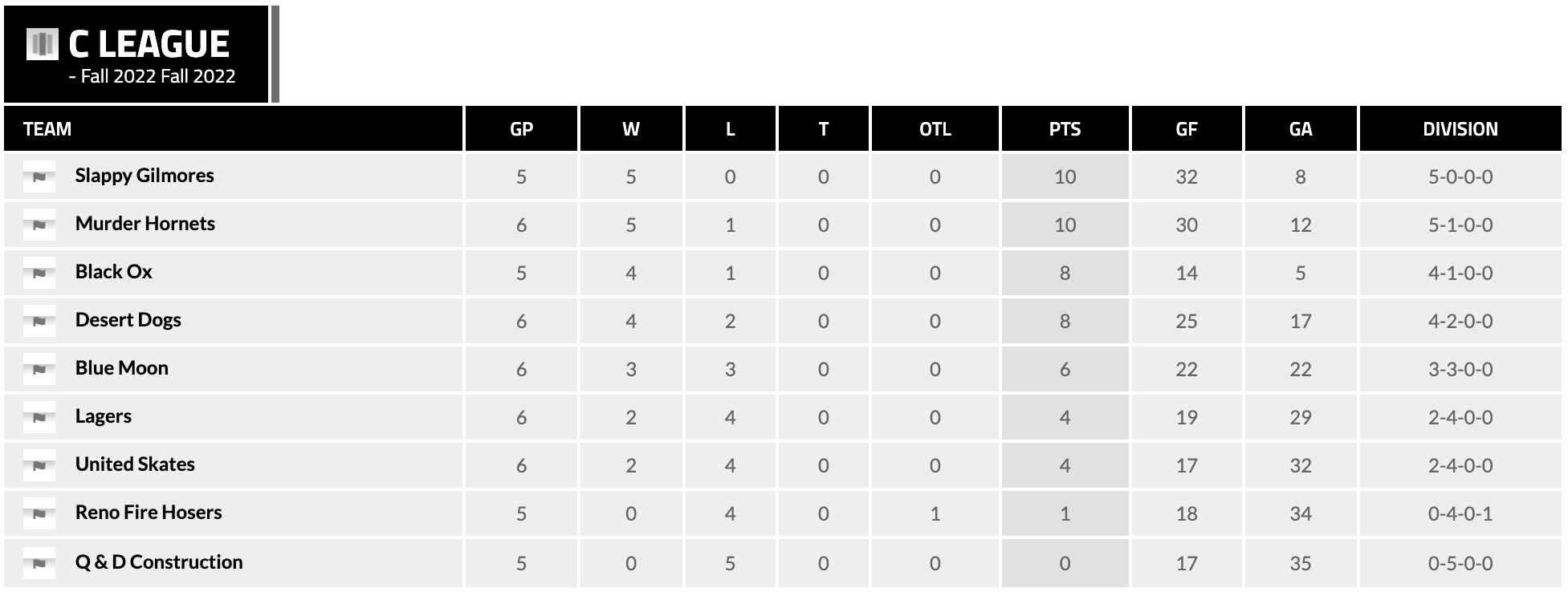 In C-League six of the nine teams moved. Slappy Gilmores take the first spot in the power rankings. It is still pretty close with the top three teams. United Skates move up after a win. Lagers move down after two losses. The Reno Fire Hosers move up and came so close to a win this week only to lose in a shootout. Reno Fire Hosers and Q&D Construction still do not have a win this season.
