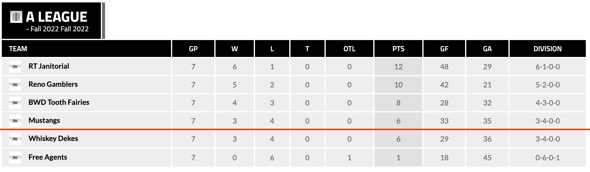 None of the teams in the A-League have qualified for the playoffs yet. None of the teams have been eliminated from playoff contention yet. Whisky Dekes has six points. The top team only has twelve points. With three games remaining six points are still on the line. Technically any of the four teams in a playoff spot right now can be eliminated. If Whisky dekes had not won their last game RT Janitorial and the Reno Gamblers would have clinched their playoff spots.