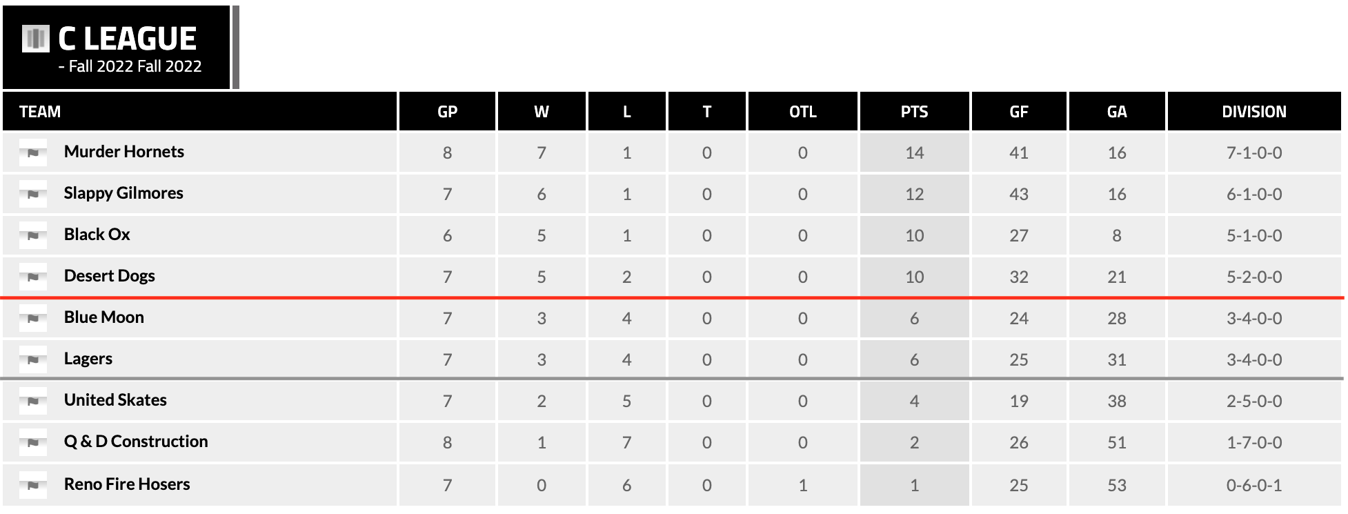 In a six-team playoff situation, The Murder Hornets and the Slappy Gilmores have secured playoff spots. Black Ox and the Desert Dogs are only one point (shootout loss or win) away from securing playoff spots. They are still not safe from elimination. That could change this week. Blue Moon and the Lagers have the last two playoff spots in this situation. United Skates are only two points (one win) away from a playoff spot. They are still contenders. Q&D Construction would have to win all of their remaining games to tie for the last playoff spot. The Reno Fire Hosers would have to win all of their remaining games with three of the teams ahead of them not getting more than seven total points this season.