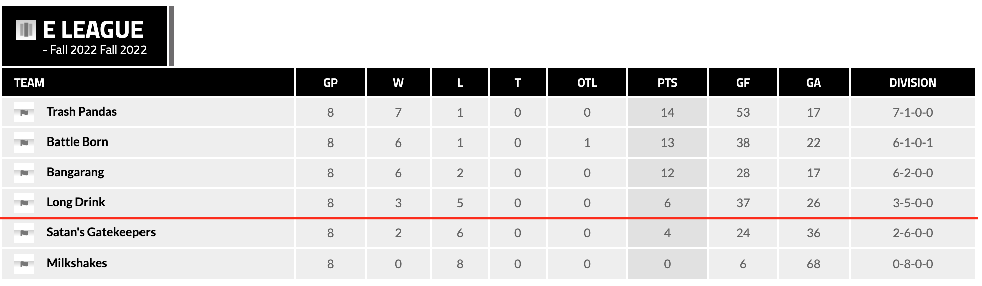 In E-League Trash Pandas, Bangarang, and Battle Born have clinched playoff spots. The Milkshakes are the first team to be eliminated from playoff contention. If Long Drink wins this week and Satan’s Gatekeepers lose, Long Drink will secure the last playoff spot.