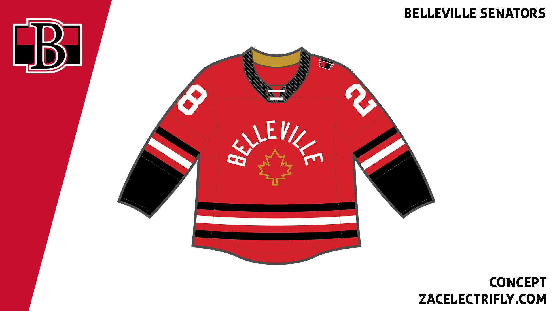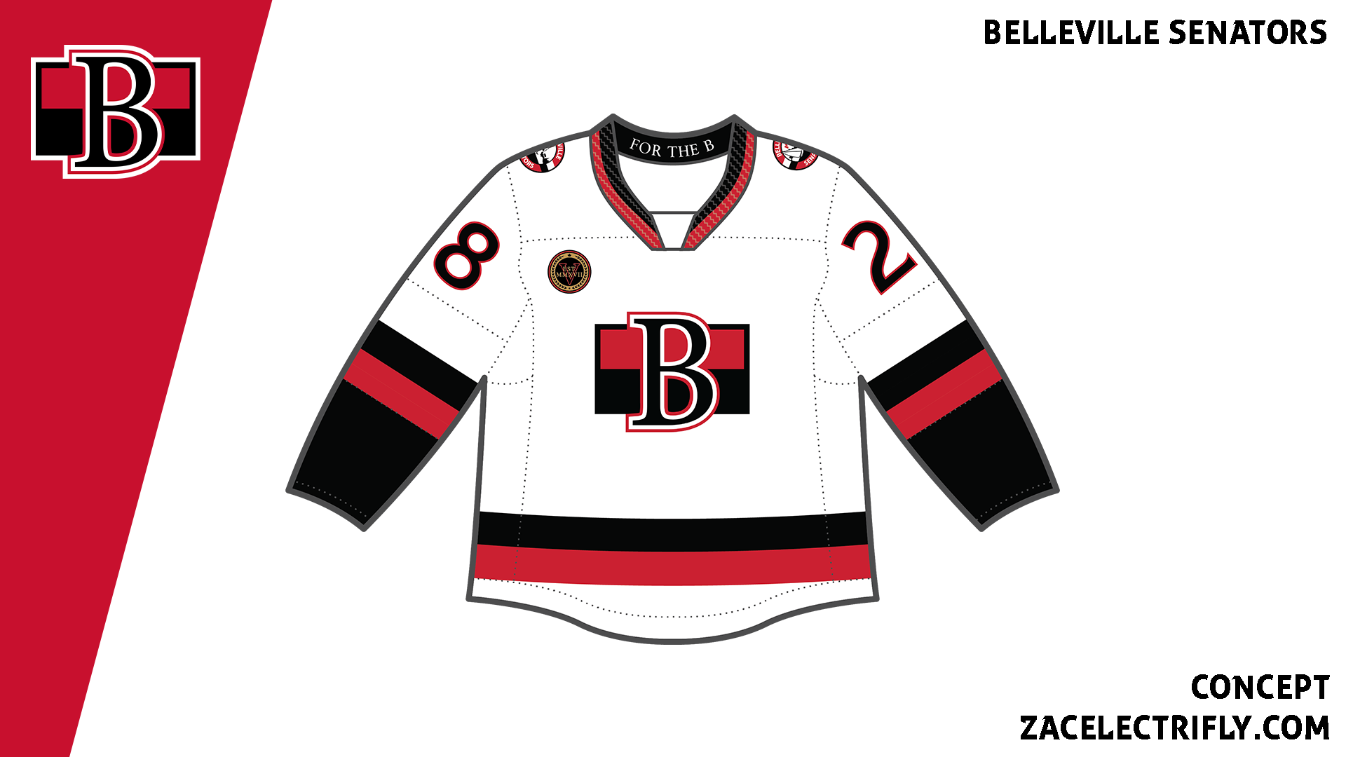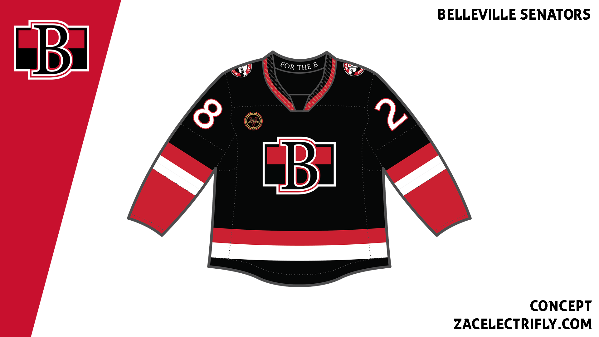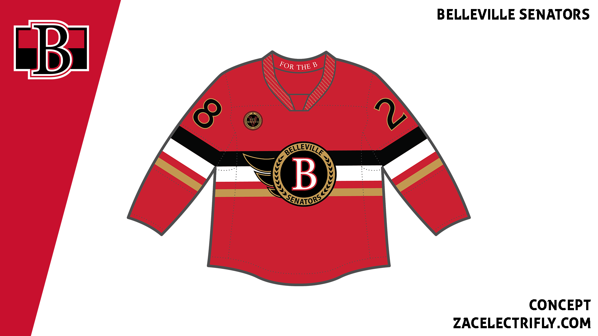 The Alternate jersey is red, black, white, and gold. On the front is the logo I created is based on the Ottawa Senators shoulder patch. the anniversary logo is also on the front. There are no shoulder logos. It says For The B” on the collar.