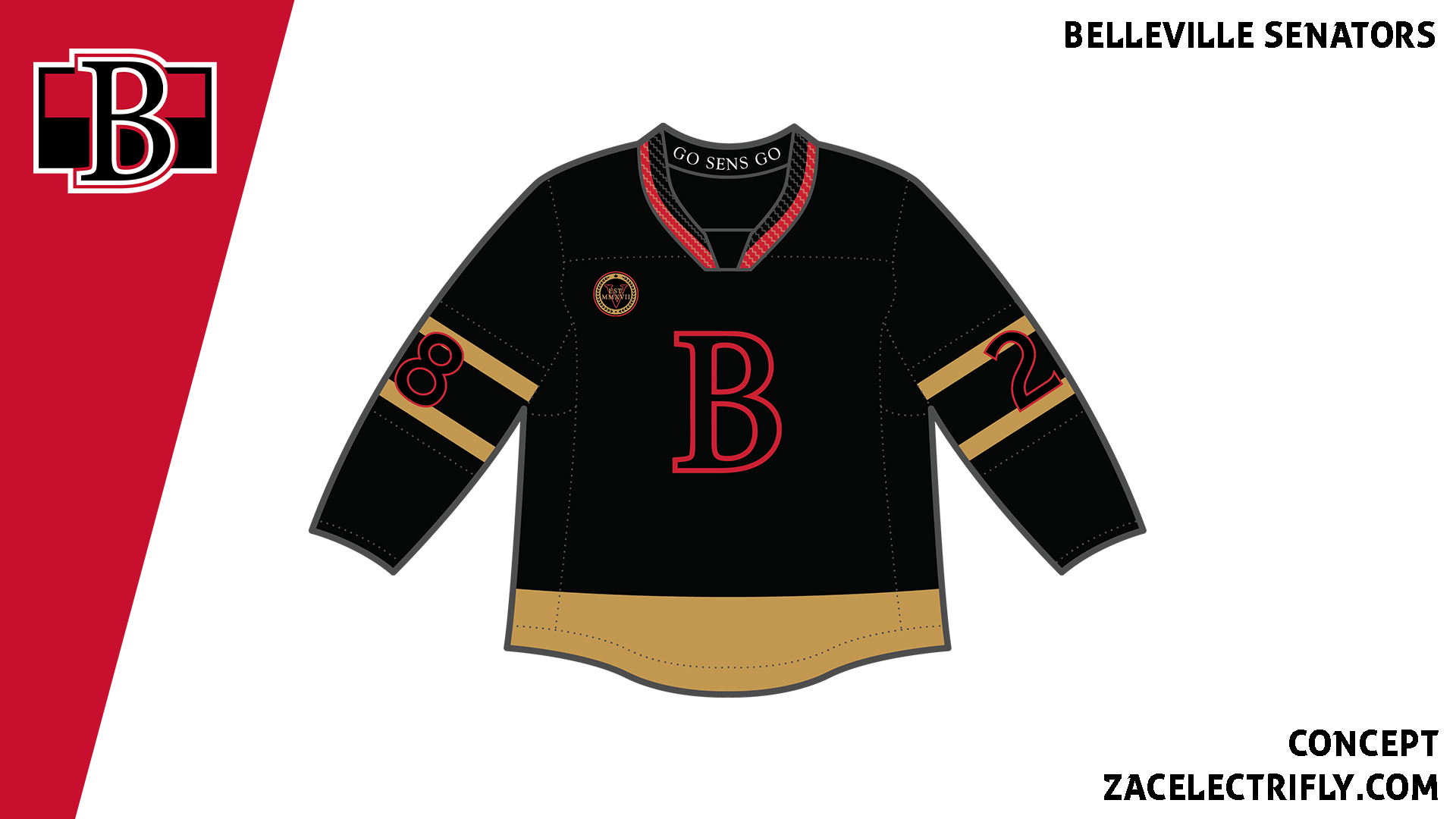 The Affiliate Remix jersey is black, gold, and red. It is based on the Ottawa Senators current black jersey. On the front is the B from the primary logo and the anniversary logo. It does not have shoulder logos. On the collar it says “Go Sens Go”.