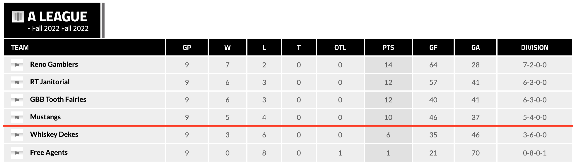 The Reno Gamblers lead the title race. With one game left they are two points (one win) ahead of RT Janitorial and the GBB Tooth Fairies. If the Reno Gamblers win or go to a shootout in their last game of the regular season, they will secure the A-League title. If they lose, RT Janitorial and the GBB Tooth Fairs can tie for the regular season title.