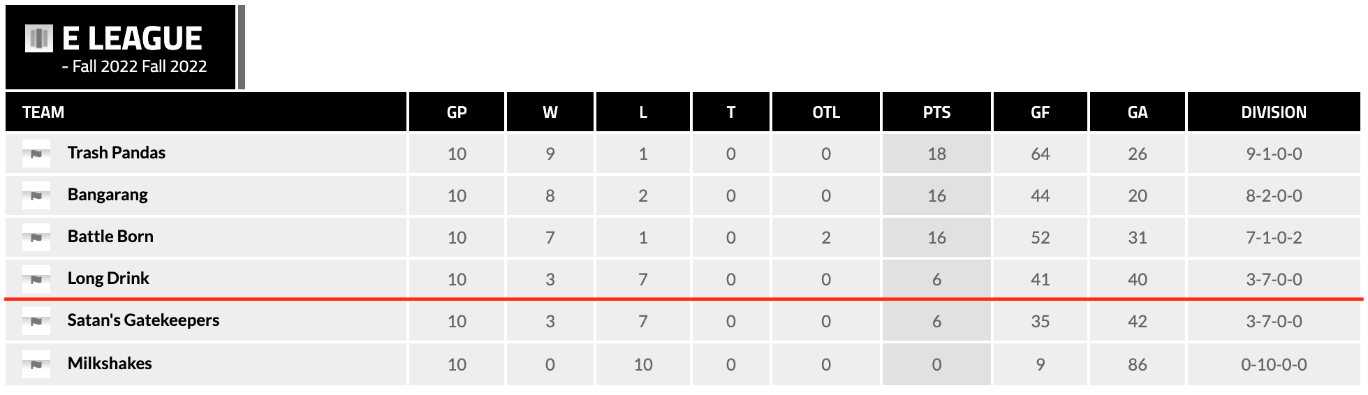 In E-League Trash Pandas, Bangarang, Battle Born, and Long Drink have clinched playoff spots. Satan’s Gatekeepers and Milkshakes have been eliminated from playoff contention. The Milkshakes have never won a game. They have gone winless during both the Spring 2022 and Fall 2022 seasons.