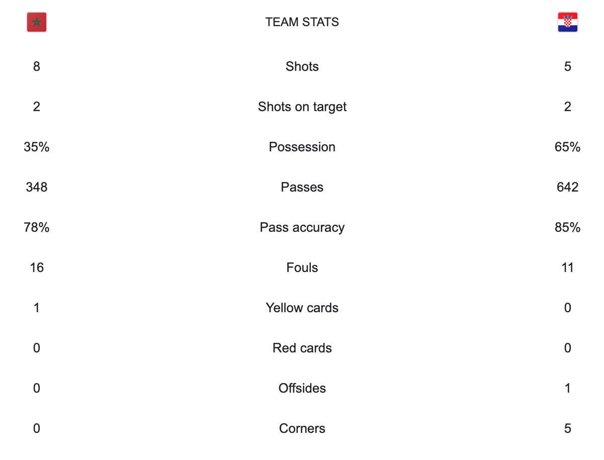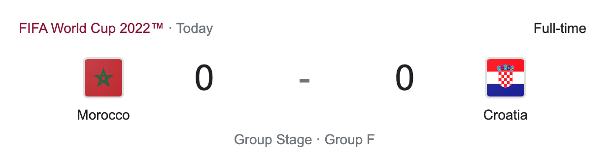 The first match today was Morocco vs Croatia. Morocco took eight shots during the game. Croatia had 65% of the possession. Neither team scored. It turned out to be an even game. The final was a 0-0 draw. I kinda expected more from Croatia in this one.