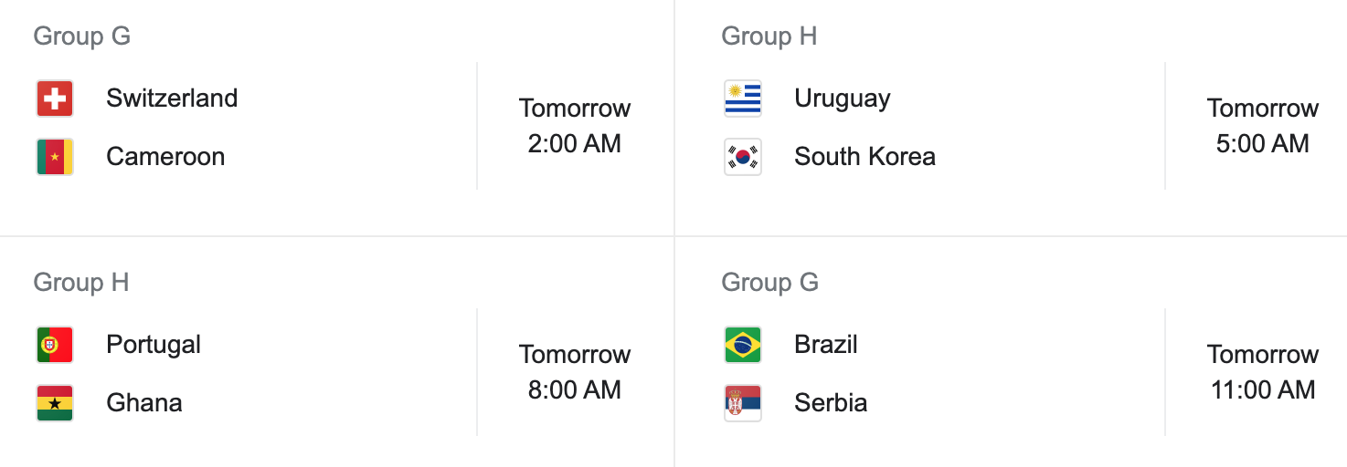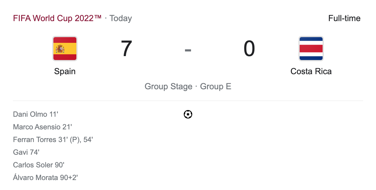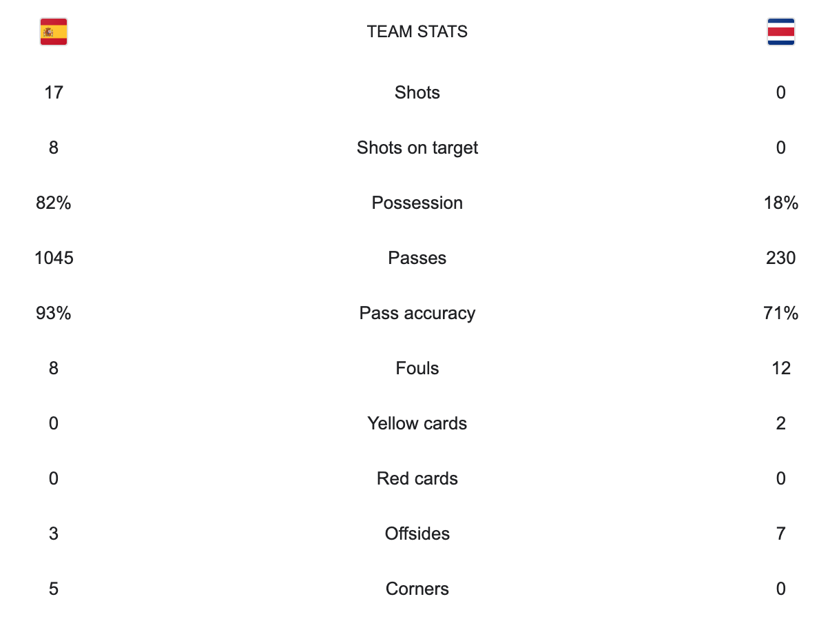 Today’s third match was Spain vs Costa Rica. Spain started the scoring in the 11′ minute and never let up. The final was 7-0. Spain went through Costa Rica like it was nothing. I said Spain would either dominate the game or it would be close. Spain dominated the game. Costa Rica did nothing to stop Spain. Spain took 17 shots. They had 82% of the possession. Costa Rica didn’t even get a shot. This is the worst start imaginable for Costa Rica.