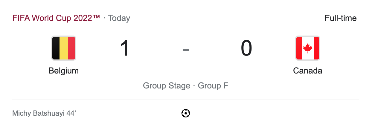 The Match I was most looking forward to today. Canada had the chance to take the lead in the first half. They had a penalty kick. Belgium’s keeper saved it. Belgium took the lead in the 44′ minute. Belgium put the ball pretty much into the box from their own side of the field. Michy Batshuayi one touched it into the back of the net. The final was 1-0 Belgium. I wanted Canada to win. The last world cup they qualified for was Mexico 1986. It was a close match. Canada took a lot of shots. I think they should take more high quality shots in their next game. The Belgium keeper made all the difference in this game. He is the reason Canada lost.