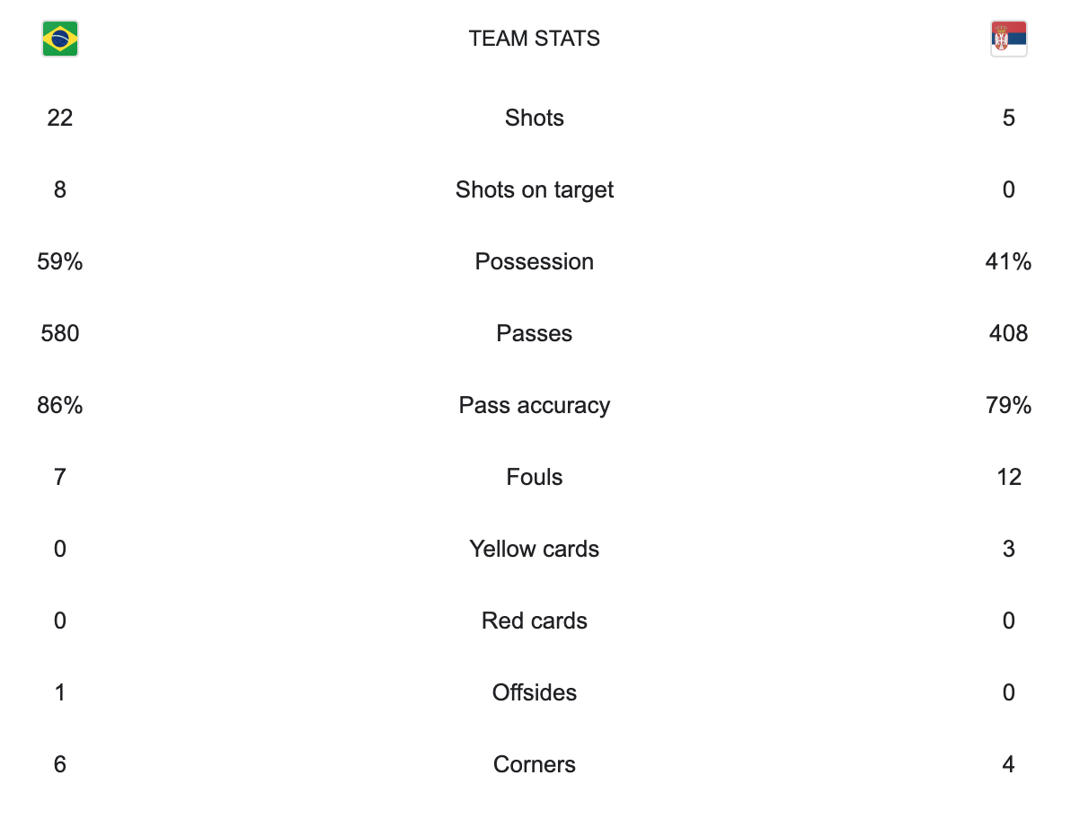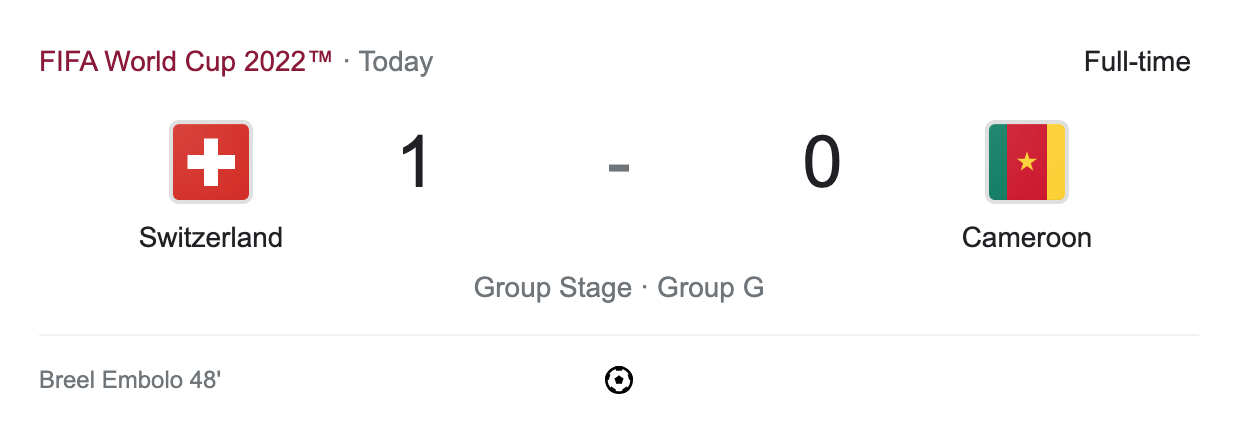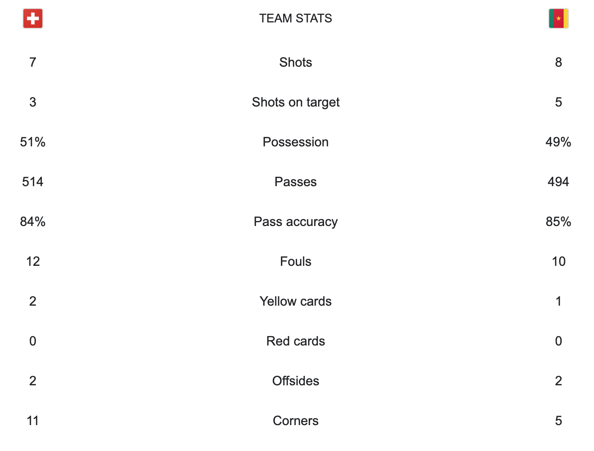 In today’s first match Switzerland played Cameroon. Neither team scored in the first half. Switzerland scored the game’s only goal in the 48′ minute of the game. The final score was 1-0 Switzerland. Cameroon had more shots and more shots on target. The possession was close. This game was a lot closer than I thought it would be.