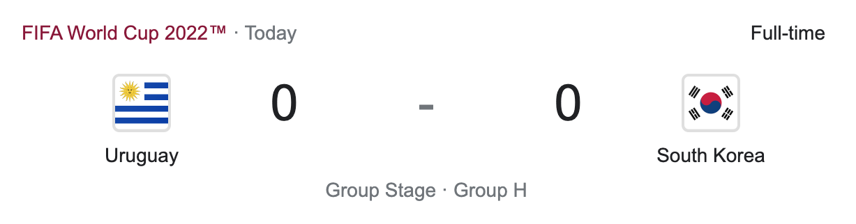 Uruguay took on South Korea for the second match of the day. Neither team could find an edge in this match. The final was a 0-0 draw. Uruguay had more shots. Uruguay had the only shot on target during the game. Possession was fairly even. I thought South Korea would have won. I thought they would have a little bit more of an edge in the game. Guess not.