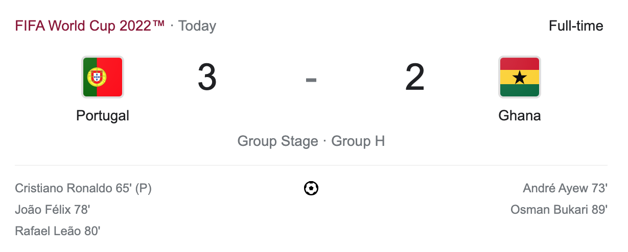 Portugal played Ghana in a very anticipated match. Portugal’s star player Christiano Ronaldo was dropped by Manchester United yesterday. That added a lot of drama to this match. No one scored in the first half. I think that was huge for Ghana. Christiano Ronaldo opened up the scoring in the 65′ minute. Ghana tied the game. Portugal took the lead. Ghana went down by two. Ghana scored in the 89′ minute to pull within one. With 9′ minutes of extra time Ghana came really close in the final minutes to tying the game. They stole the ball from the goalie inside of the box in the final minutes of the game. They didn’t get the ball cleanly and couldn’t take a shot. the final was 3-2 Portugal. The game was a lot closer than I thought it would be. I thought Portugal would destroy Ghana. Ghana held their own though.