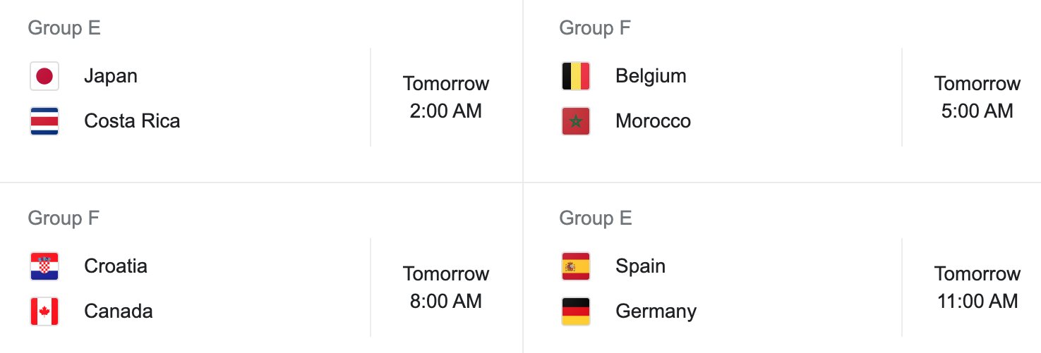 Japan vs Costa Rica. Will Japan continue to play at the elite level they did against Germany? Belgium vs Morocco. Belgium should win that game. Croatia vs Canada. Will Canada have the bounce-back game they need? Spain vs Germany. That is the match to watch tomorrow. If Germany plays up to what’s expected it should be a close hard-fought match. Will Spain continue to dominate and put up another six goals? Will Germany put up a fight a game one upset?