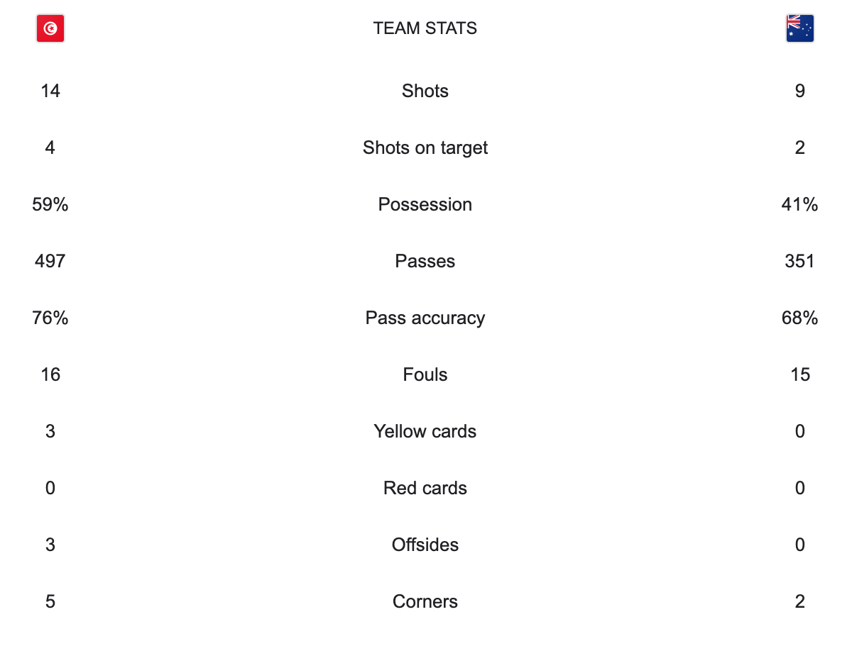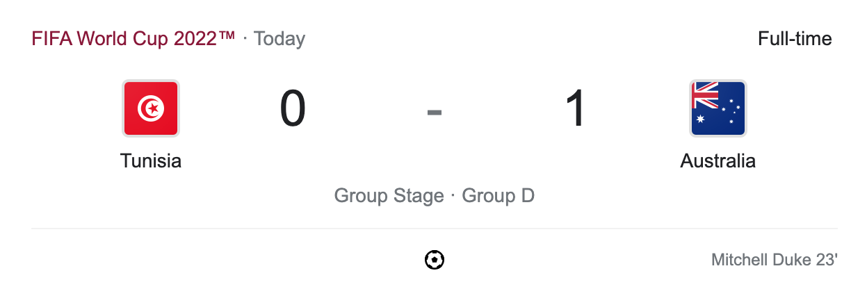 The first match of the day was a Group D match between Tunisia and Australia. Australia took the lead in the 23′ minute. Australia put the ball in the box. It took a weird bounce on its way in. They were able to head it into the back of the net. Australia took a 1-0 lead into the second half. They were able to hold onto their lead to win the game. The final was 1-0 Australia. Tunisia had a few more shots than Australia. They just couldn’t find the back of the net. Possession was pretty even. In the end it was a hard battle and a close game.