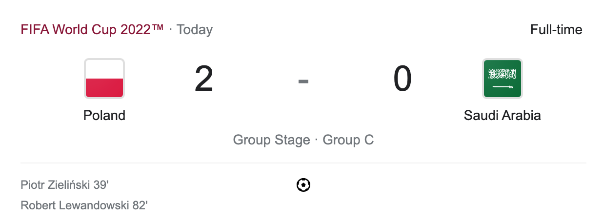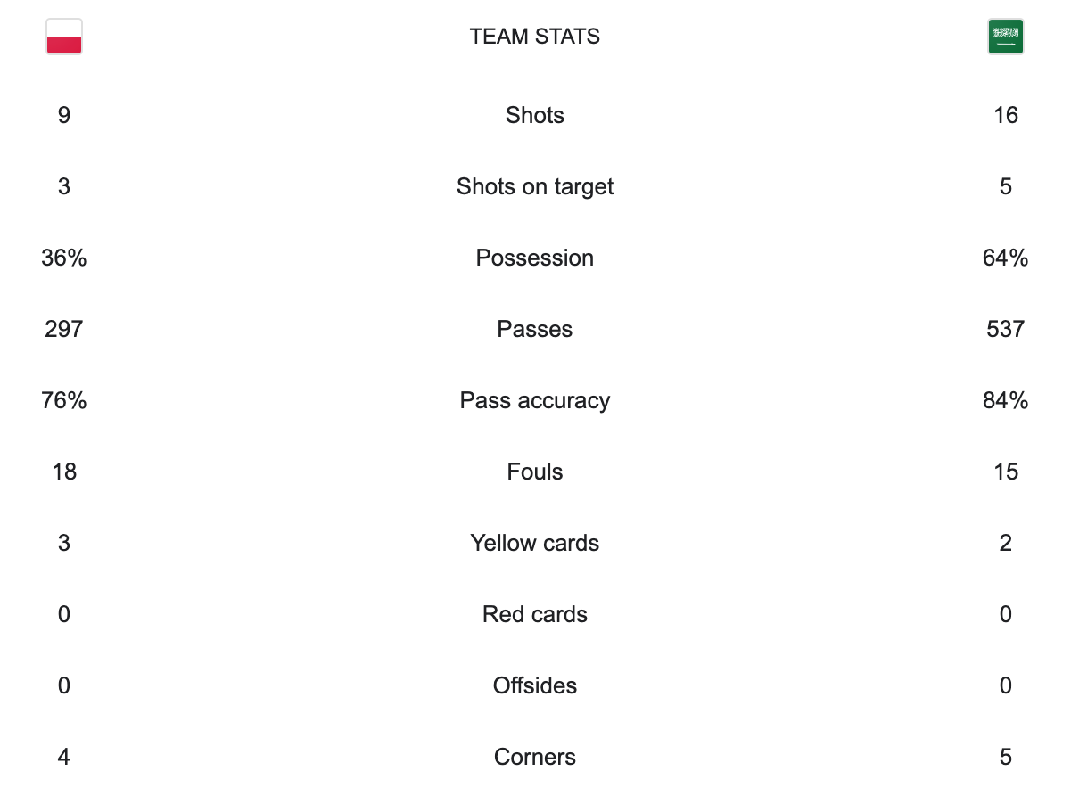 Match two today saw Poland take on Saudi Arabia. Poland opened up the scoring in the 39′ minute. Poland started the pay by passing from above the box to the side of the box. From there it was put into the middle where the goalkeeper deflected it. Poland kept possession. They put it back in the middle and scored. Just before halftime Poland blocked a penalty kick and the rebound. Poland took a 1-0 lead into halftime. Poland added to their lead in the 82′ minute. A careless turnover by Saudi Arabia above their box led to Poland’s second goal. The final was 2-0 Poland. Poland’s goalkeeper made the difference in this one. He stopped all 16 of Saudi Arabia’s shots including a penalty kick. According to the stat sheet Saudi Arabia was in control of this game. They just couldn’t get past the Polish goalkeeper.