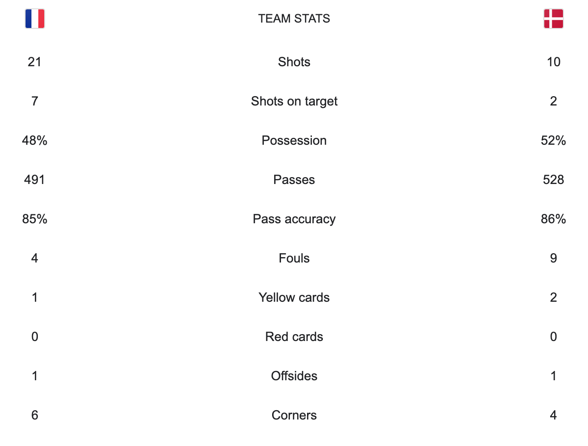 France played Denmark in today’s third match. Neither team scored in the first half. Both teams traded off chances. The Denmark keeper gave his team a chance going into the second half. France opened the scoring in the 61′ minute. France took the ball into the box. It was passed over to the side of the box. The ball was passed back towards the middle where it was one touched into the net. Denmark would respond in the 68′ minute. Off a corner kick, the ball went through some players towards the other side of the box where it was headed in. France would score the game winning goal in the 86″ minute. The ball was lobbed from the side of the box. France was able to deflect the ball into the net. The final score was 2-1 France. France had double the shots Denmark had. That goes back the the Danish keeper keeping them in the game. Possession was pretty even. In the end it was a close game and France just go the edge over Denmark.