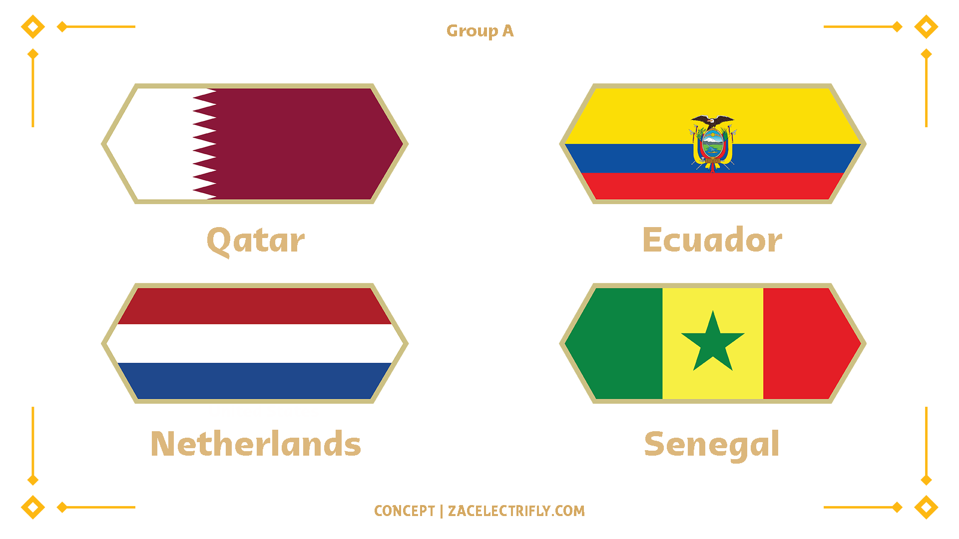 The jersey matchups are based on Qatar 2022 kit matchup information from Footy Headlines. Qatar will wear both of their jerseys during the group stage. Ecuador will wear their yellow and blue jerseys during the group stage. Their white jersey is absent. The Netherlands will only wear its gold jersey during the group stage. Senegal will only wear its white jersey during the group stage.