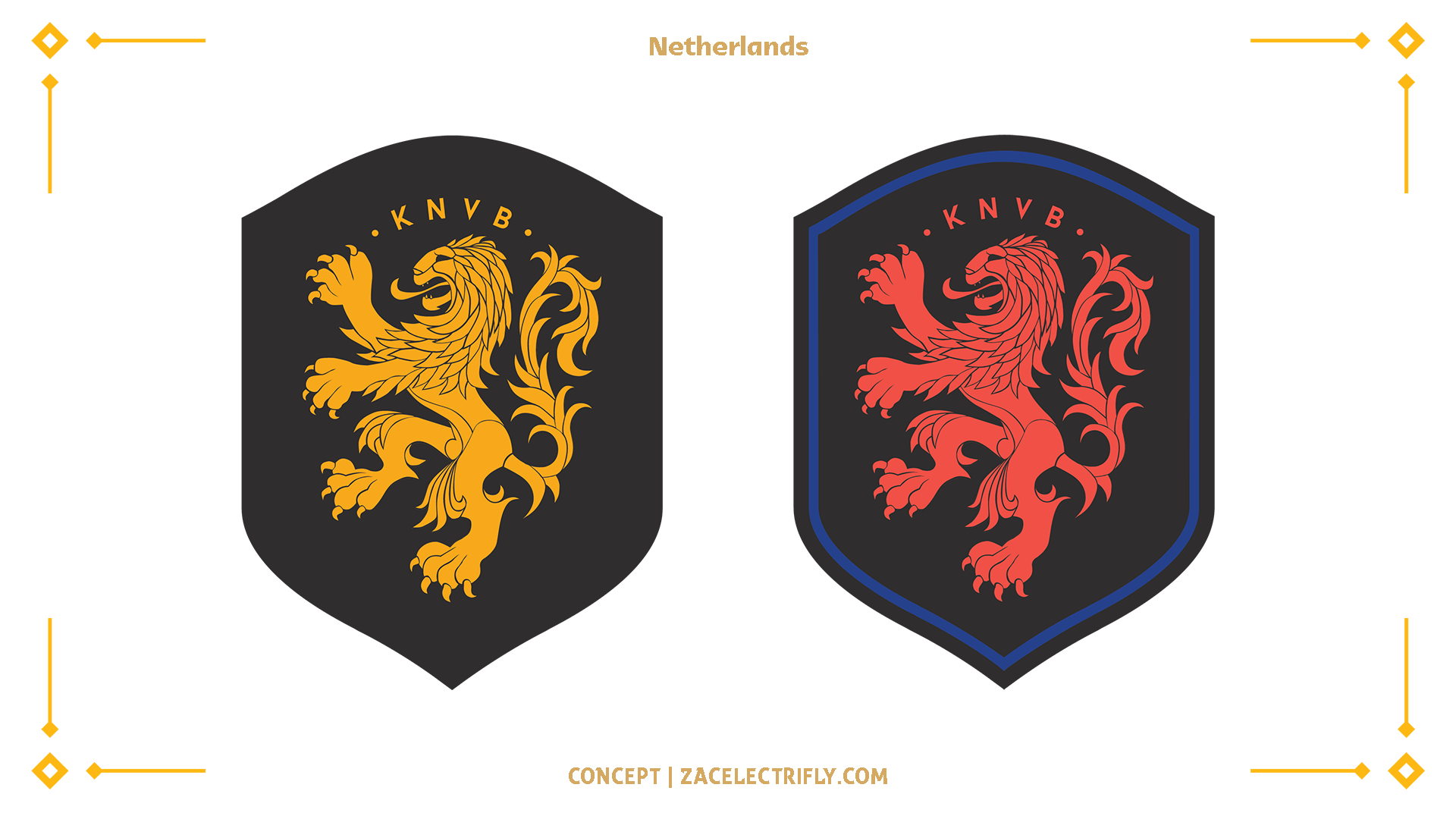 The Netherlands is sponsored by Nike. Their colors are orange, black, and white. For Qatar 2022 the Netherlands went with black, blue, gold, and a different shade of orange. The Netherlands have a gold jersey and a blue jersey. They both have the same template. I did not modify the logos beyond what they did for Qatar 2022.