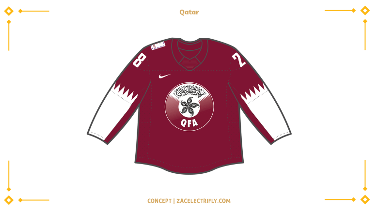 Qatar is sponsored by Nike. Their colors are maroon and white. With their logo, I got rid of its soccer symbolism. They have a maroon jersey and a tan jersey. The pattern is the same on both jerseys.