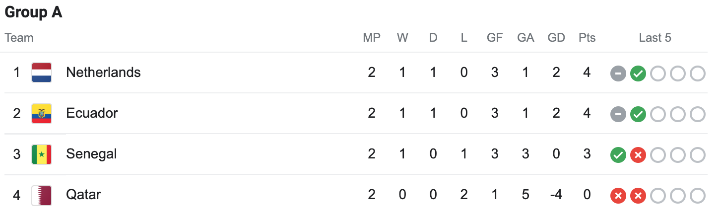 A lot is riding on the final matches of the group stage. Ecuador vs Senegal. A win or draw for Ecuador would put them into the elimination round. A win would get Senegal out of the group stage. If they draw and the Netherlands loses they will tie and could get out of the group stage on tiebreakers. This should be a close match with elimination round hopes on the line for both teams.