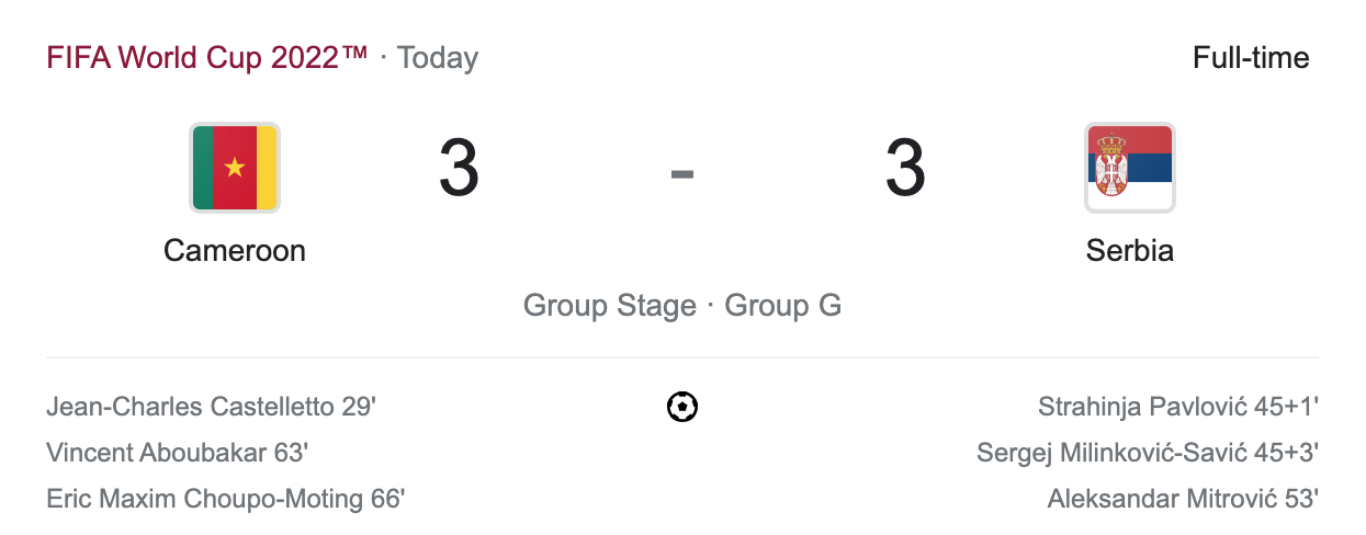 Match one today was a Group G match between Cameroon and Serbia. Cameroon opened the scoring in the 29′ minute. Serbia would tie the game and take the lead in extra time during the first half. The score was 2-1 Serbia going into the second half. Serbia added to their lead in the 53′ minute. Cameroon cut the lead down in the 63′ minute. They tied the game in 66′ minute. The game ended in a 3-3 draw. Neither team could hold the lead in this one. Shots were about even with Serbia having 60% of the possession. Serbia should have won bit Cameroon now has an incredible come back story.