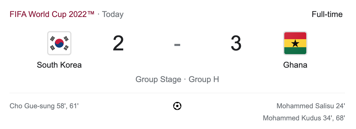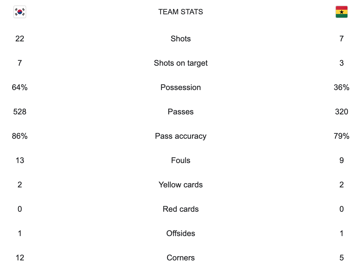 In today’s second match Ghana took on South Korea. Ghana opened the scoring in the 24′ minute. Ghana added to their lead in the 34′ minute. It was 2-0 Ghana going into the second half. South Korea would score in the 58′ and 61′ minutes to tie the game. Ghana would seal their win with a goal in the 68′ minute. The final was 3-2 Ghana. South Korea heavily outshot Ghana. They also had majority of possession and set pieces. Despite this South Korea couldn’t best Ghana.