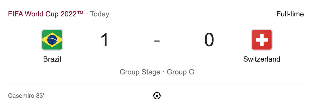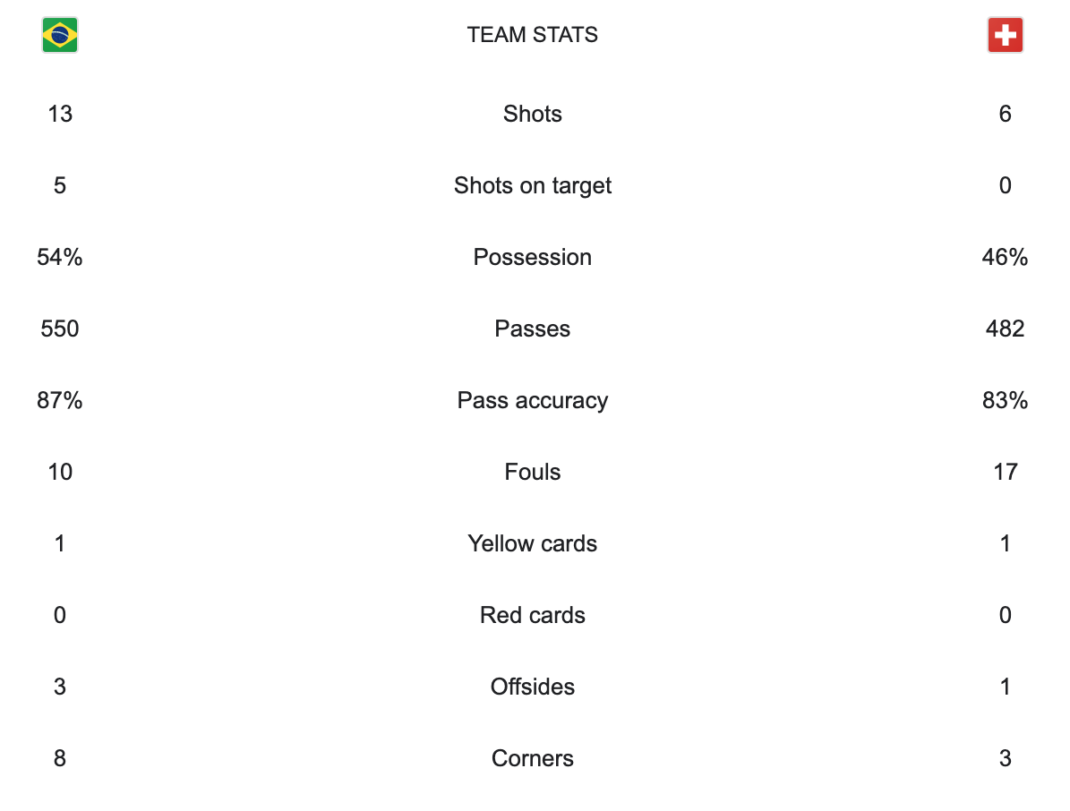 Today’s third match saw Brazil take on Switzerland. No one scored in the first half. Brazil broke the stalemate in the 83′ minute. The final was 1-0 Brazil. Brazil had the majority of the shots. Possession was pretty close. It seemed like Brazil had a few more chances. They should have netted a few more goals. In the end, Switzerland stayed in the game and put up a fight, but Brazil walked away with the win.