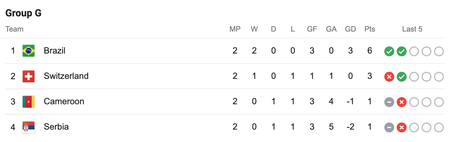 Brazil stays in control of Group G. Serbia is now last in Group G. Portugal still leads Group H. Uruguay is in last in Group H