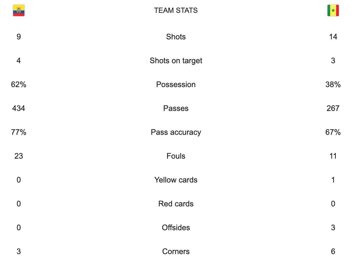 Ecuador played Senegal. A win or draw for Ecuador would put them into the elimination round. A win would get Senegal out of the group stage. If they draw and the Netherlands loses they will tie and could get out of the group stage on tiebreakers. Senegal opened the scoring in the 44′ minute. They score the game’s opening goal on a penalty kick. Senegal had a 1-0 lead at halftime. Ecuador tied the game in the 67′ minute. Just a few minutes later Senegal would take the lead again. In the 70′ minute they scored the go-ahead goal. The final was a 2-1 Senegal win. With the win, Senegal advanced out of the group stage and into the round of 16. Ecuador was eliminated after their loss. The game was pretty even. Ecuador had more of the possession but just could find a way to win.