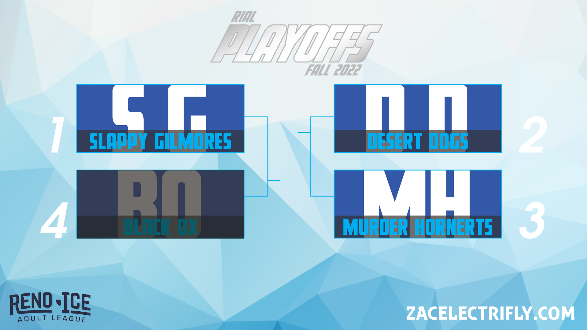 The Reno Ice Adult League Fall 2022 Playoffs continue tonight. Last night was the first C-League Semifinal. The 1-seed Slappy Gilmores played the 4-seed Black Ox. Tonight is the other C-League Semifinal. For that game the 2-seed Desert Dogs take on the 3-seed murder hornets. The puck drop is set for 10:30pm tonight.