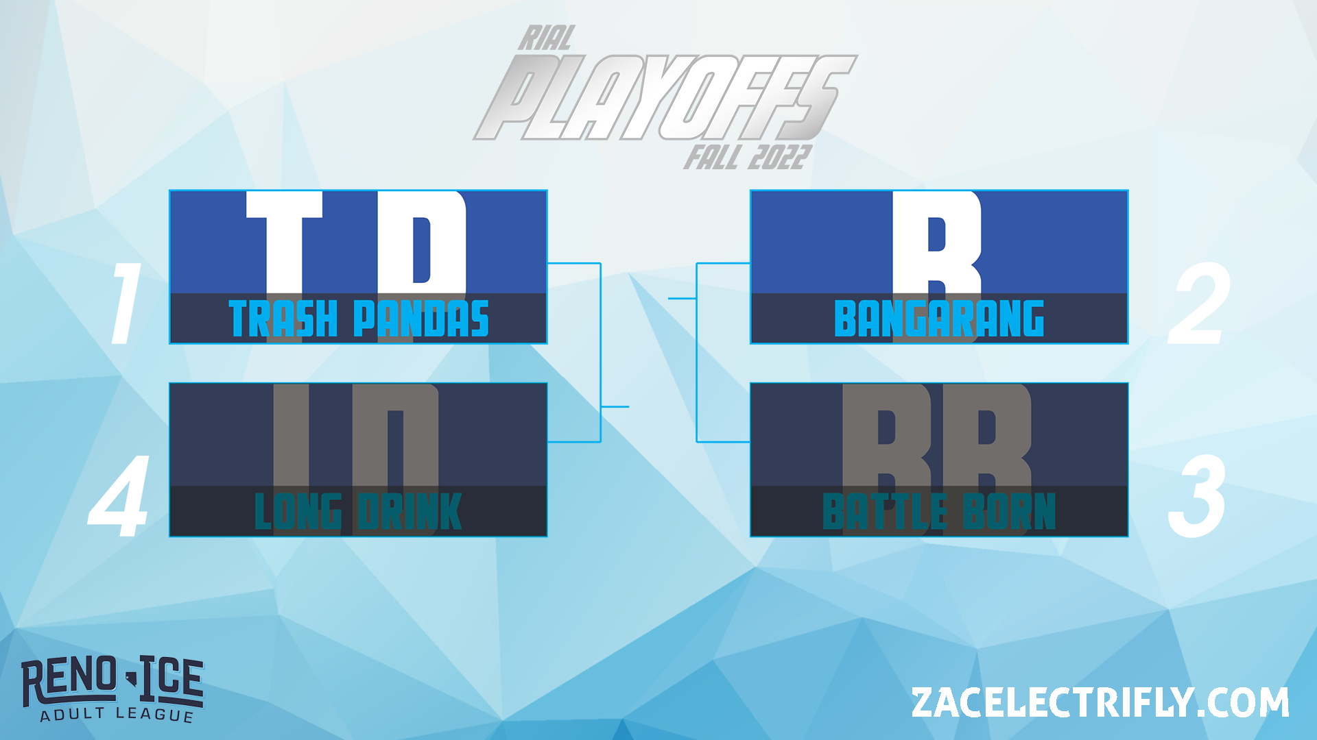 The Reno Ice Adult League Fall 2022 Playoffs continued with the second E-League Semifinals. Both Semifinal games were last night. The 1-seed Trash Pandas took on the 4-seed Long Drink. Then the 2-seed Bangarang played the 3-seed Battle Born. The playoffs will continue on December 4th with Championship Sunday.