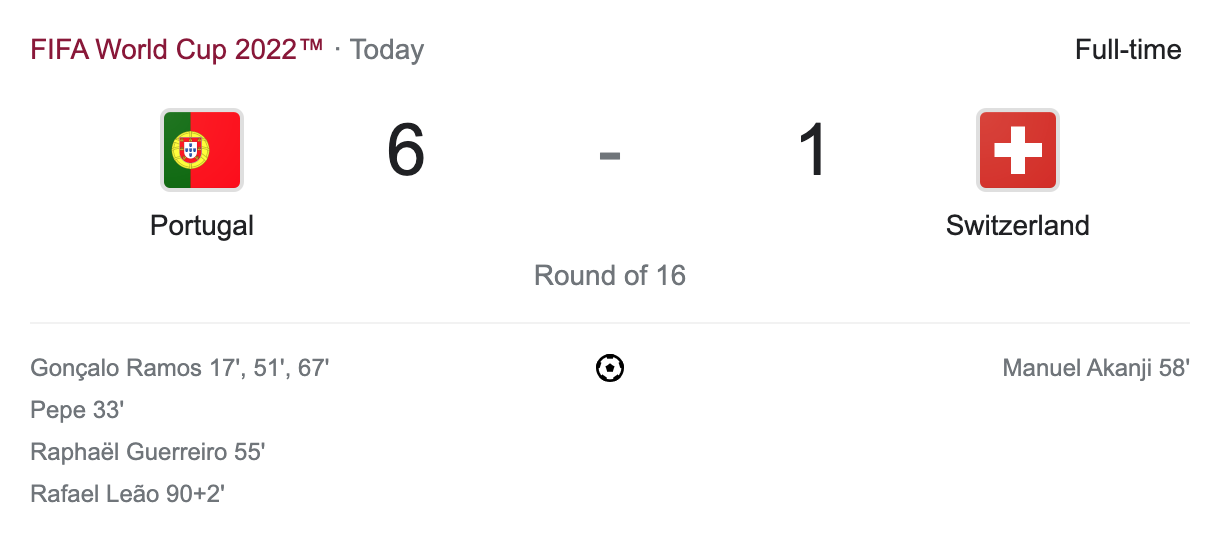 For today’s second match Portugal played Switzerland in the final round of 16 match. Portugal was heavily favored to win this one. Portugal got the scoring going in the 17′ minute. They would add to their lead in the 33′ minute. Portugal would take a 2-0 lead into halftime. Not a huge lead but it could have been enough to keep the game out of Switzerland’s hands. In the second half Portugal would just take over. They scored in the 51′ minute, 53′ minute, 67′ minute and the 90+2′ minute. Switzerland would score one in the 58′ minute. Portugal had already scored four by that point though. The final score was 6-1 Portugal. Not surprising Portugal won. Switzerland is headed home. Portugal will be moving on to face Morocco in the quarter-finals. Goncalo Ramos is the first person in this world cup to get a hat trick. Despite the massive victory by Portugal, Cristiano Ronaldo did not score.
