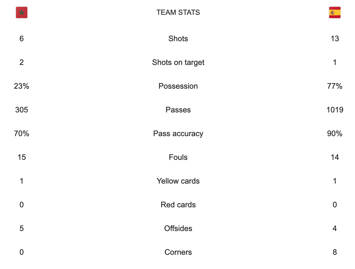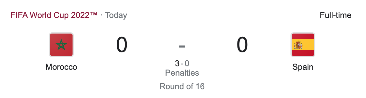 Today’s first match was Morocco vs Spain. Spain was heavily favored to win this game. Neither team scored in the first half. It was a 0-0 draw at halftime. Morocco managed to keep Spain out of their net in the second half too. The game would end in a 0-0. No one scored in extra time either. It went to penalties. Morocco won the penalty shootout. The game would end in a 0-0 draw with Morocco winning on penalties. It is the second game in two days that has required penalties to decide a winner. Morocco will advance. Spain will see their disappointing world cup run come to an end. This is a huge upset for Spain. Moroccos goal keeper won this one for them. Morocco will now face the winner of Portugal vs Switzerland in the quarter-finals.