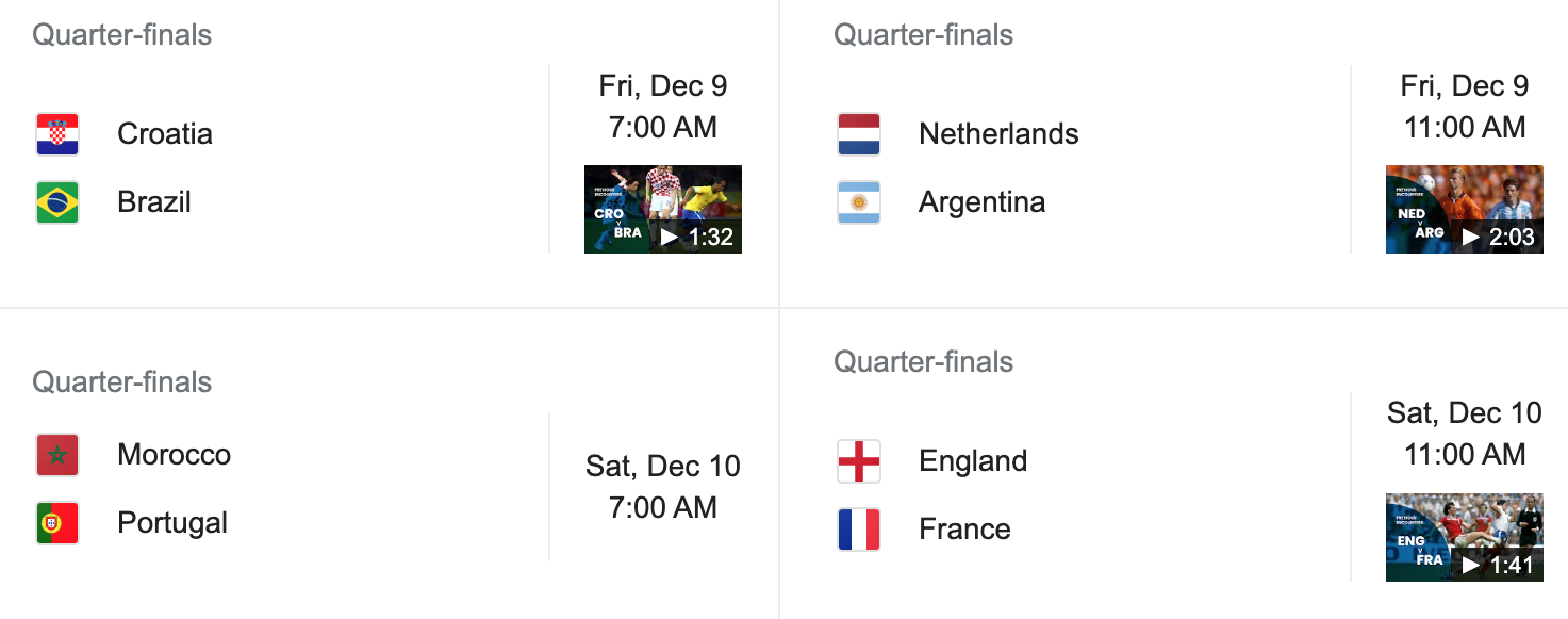 The round of 16 is now over. The quarter-finals are up next. The Netherlands, Argentina, England, France, Croatia, Brazil, Morocco, and Portugal have advanced to the quarter-finals.