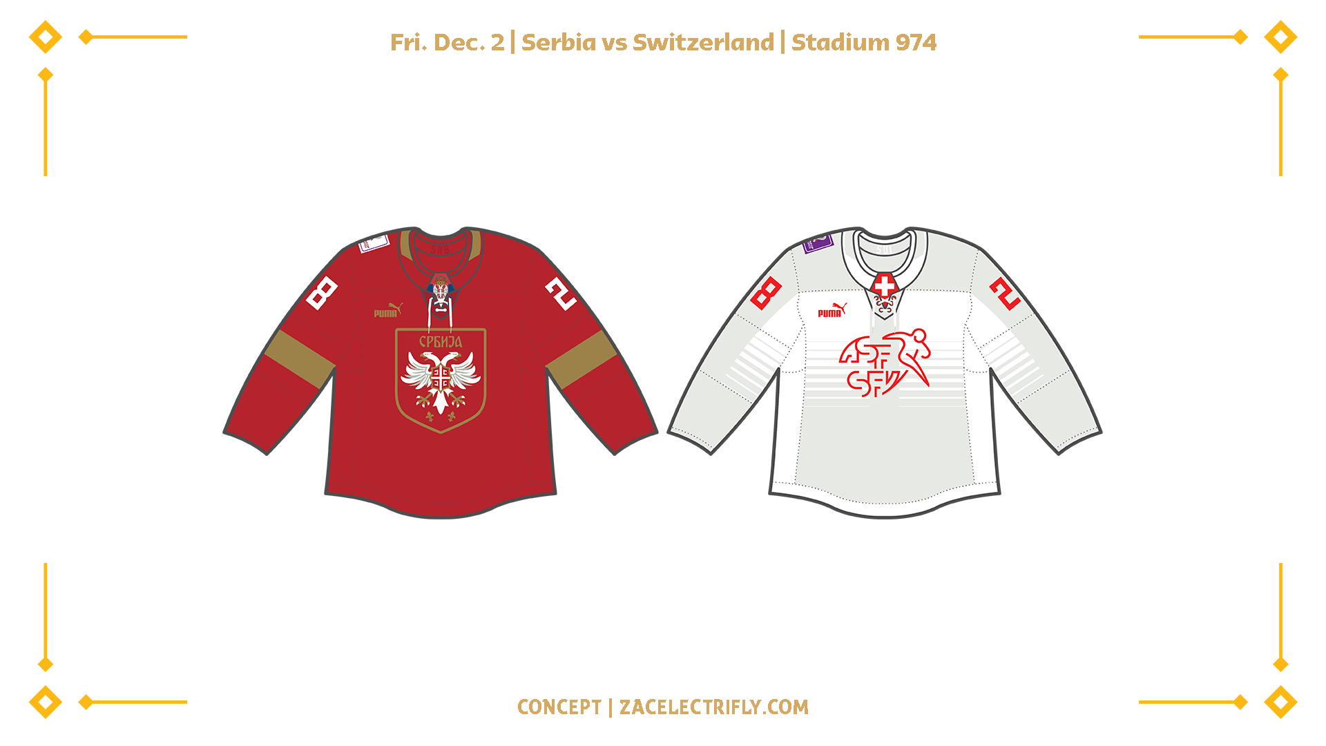 I’m here with Group G concepts for Qatar 2022. In my last post, I showed off my concepts for Group F. In my first post, I talked about the event itself. I have also talked about my concepts for Group A, Group B, Group C, Group D, and Group E. Brazil, Cameroon, Serbia, and Switzerland make up Group G. Brazil are unranked by the IIHF. Brazil does not look like it has a league. Cameroon is not a member of the IIHF or have a league. Serbia is ranked 30th by the IIHF. The Serbian Hockey League is the top league in Serbia. Switzerland is ranked 7th by the IIHF. The National League is the top pro league in Switzerland.