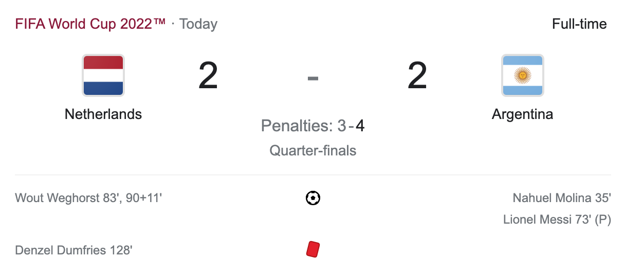It was a huge comeback effort by the Netherlands after I think a lot of people assumed the game was over. There were two incredible games today. The Netherlands did put up a fight. Argentina just was able to do better on penalties. Argentina will now move on to the semi-finals. Lionel Messi is now one game away from reaching the world cup final. The Netherlands are headed home. Argentina will play Croatia in the semi-finals. The winner will move on to the world cup final.