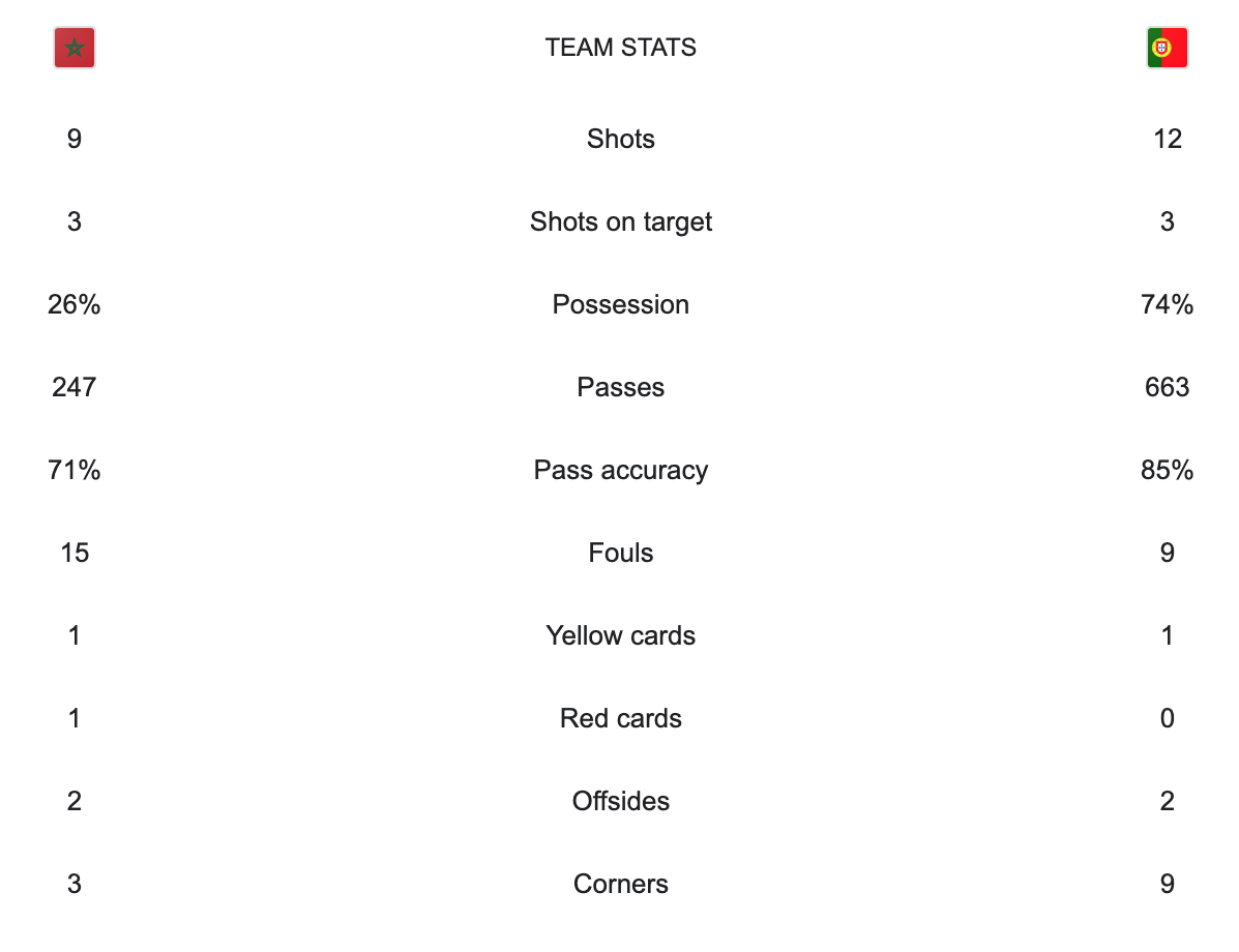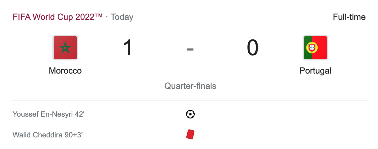 Today’s first quarter-finals match was Morocco vs Portugal. Morocco beat Spain in the round of 16 to reach the quarter-finals. Portugal beat Switzerland to advance to the quarter-finals. Portugal was favored to win this match. Morocco scored in the 42′ minute to take the lead. They held on to a 1-0 lead going into halftime. Neither team scored in the second half. Morocco got a red card on the 90+3′ minute. The final was 1-0 Morocco. In another big upset for Morocco they knock out a favorite Portugal. Morocco has advanced to the semi-finals where they will play the winner of England vs France.