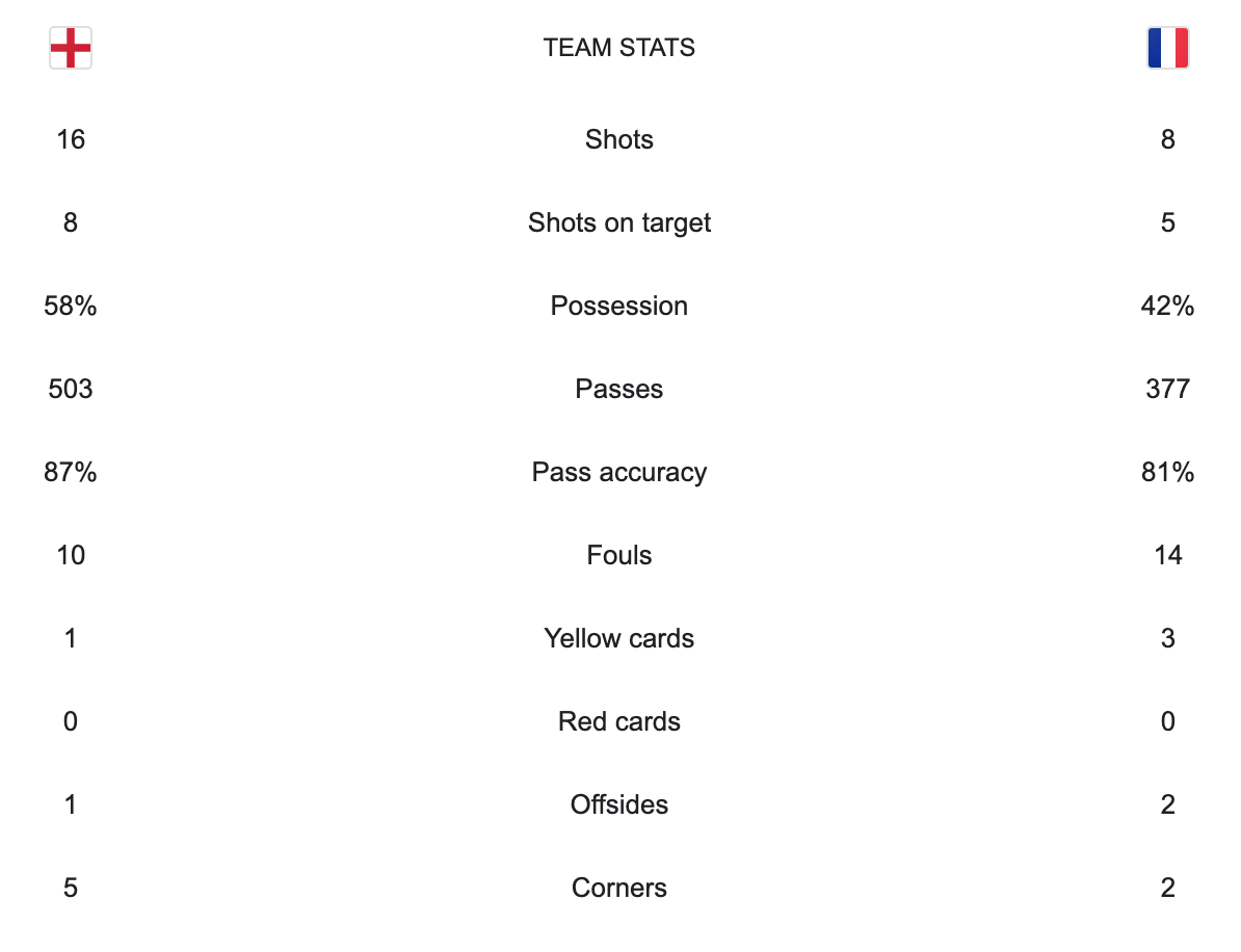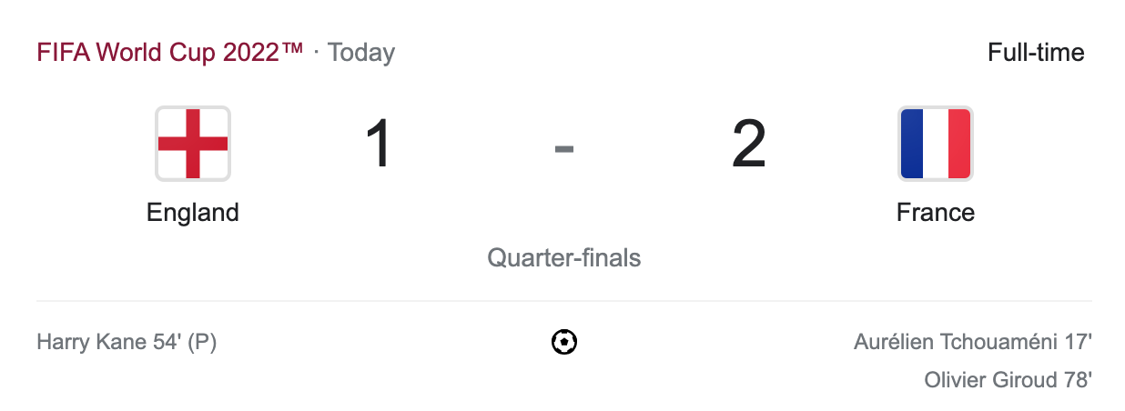 England faced France in today’s second quarter-finals match. England beat Senegal to reach the quarter-finals. France beat Poland in the round of 16 to advance to the quarter-finals. France scored the opening goal in the 17′ minute. France would take a 1-0 lead into the second half. England tied the game in the 54′ minute. France took the lead again in the 78′ minute. The final was 2-1 Fracne. England had majority of possession and outshot France. France still found a way to win. It’s not coming home as England is now eliminated from the world cup. France has advanced to the semi-finals. France will play Morocco in the semi-finals.