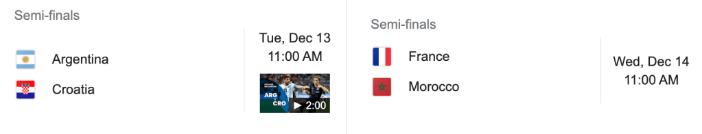 Argentina, Croatia, Morocco, and France have advanced to the semi-finals. The other semi-final matchup will be set after tomorrow’s matches.