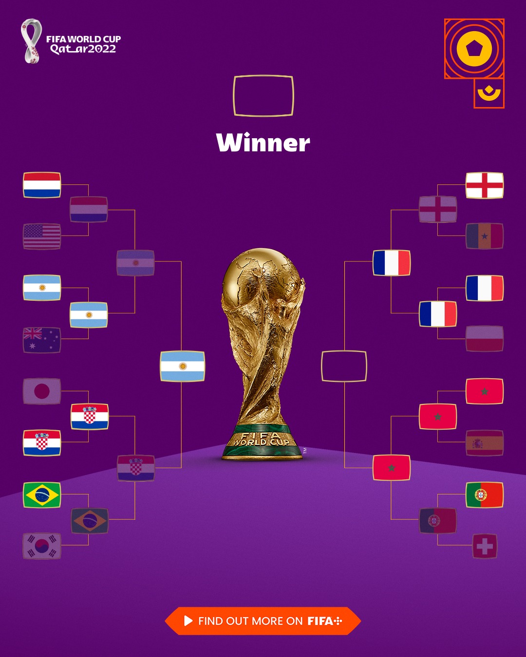 The Netherlands, Senegal, England, the United States, Argentina, Poland, France, Australia, Japan, Spain, Morocco, Croatia, Brazil, Switzerland, Portugal, and South Korea have advanced to the elimination stage.
