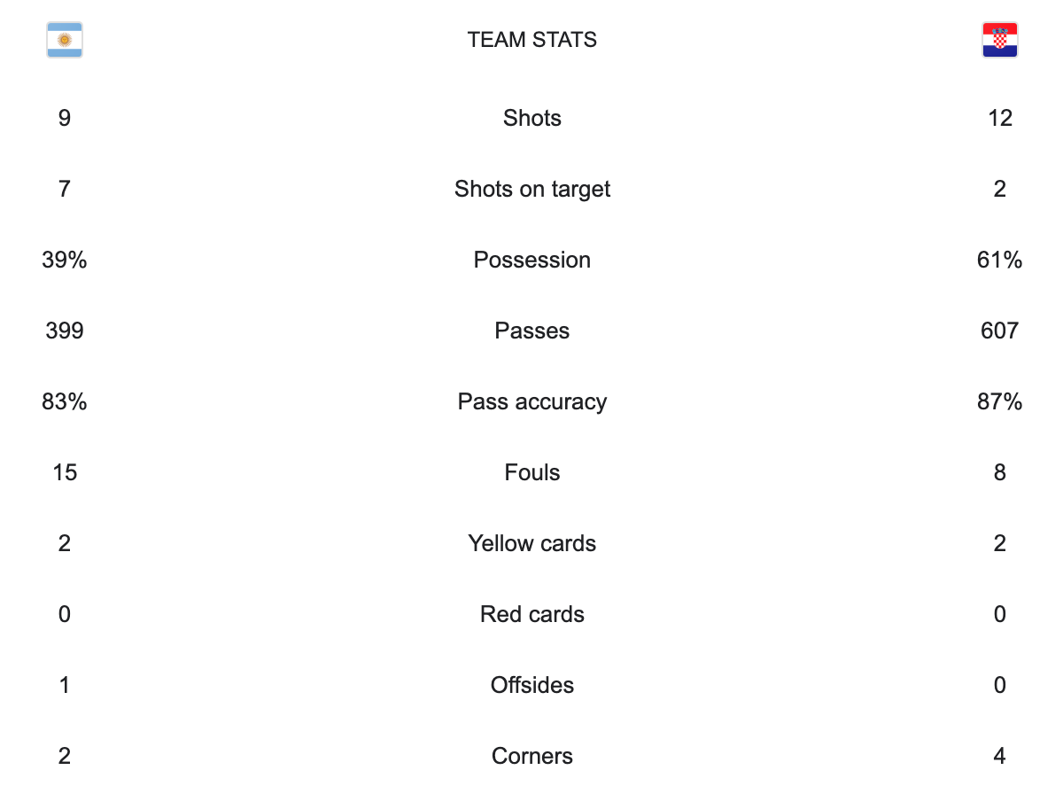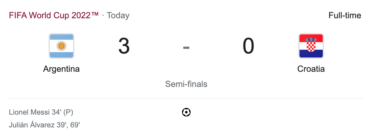 In today’s only world cup match, Argentina played Croatia in the semi-finals. Argentina beat Australia and the Netherlands to reach the semi-finals. Croatia beat Japan and Brazil to reach the semi-finals. Argentina scored their first goal on a penalty in the 34′ minute. They added to their lead a few minutes later in the 39′ minute. Argentina took a 2-0 lead into the second half. In the 69′ minute Argentina scored again. The final was 3-0 Argentina. Croatia had the majority of possession. They had more shots. Argentina still made it look easy. Argentina moves on. They have reached the world cup final. Argentina last made it to the world cup final in 2014 where they lost 1-0 to Germany. Croatia is not going home yet. They will be playing in the third place game. Argentina are now waiting for the winner of the France vs Morocco game.