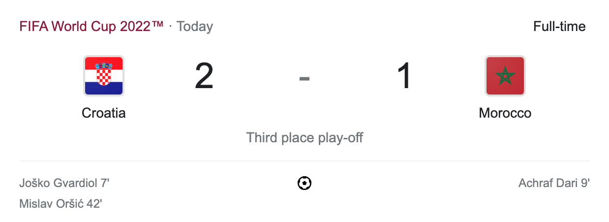 Croatia took on Morocco in the third-place game for the FIFA World Cup Qatar 2022. Croatia lost to Argentina in the semi-final to be sent to this game. Morocco lost to France in the semi-final sending them to the third-place game. Croatia and Morocco were both in Group F. Their group-stage match ended in a 0-0 draw. Croatia scored the first goal in the 7′ minute. Morocco answered in the 9′ minute with the tying goal. Croatia took the lead right before halftime with a goal in the 42′ minute. The score was 2-1 Croatia going into the second half. Neither team scored in the second half. The final would be 2-1 Croatia. Croatia had more shots but they were close. Possession was close. It was a close game with Croatia just edging out Morocco. With that Croatia took third place.