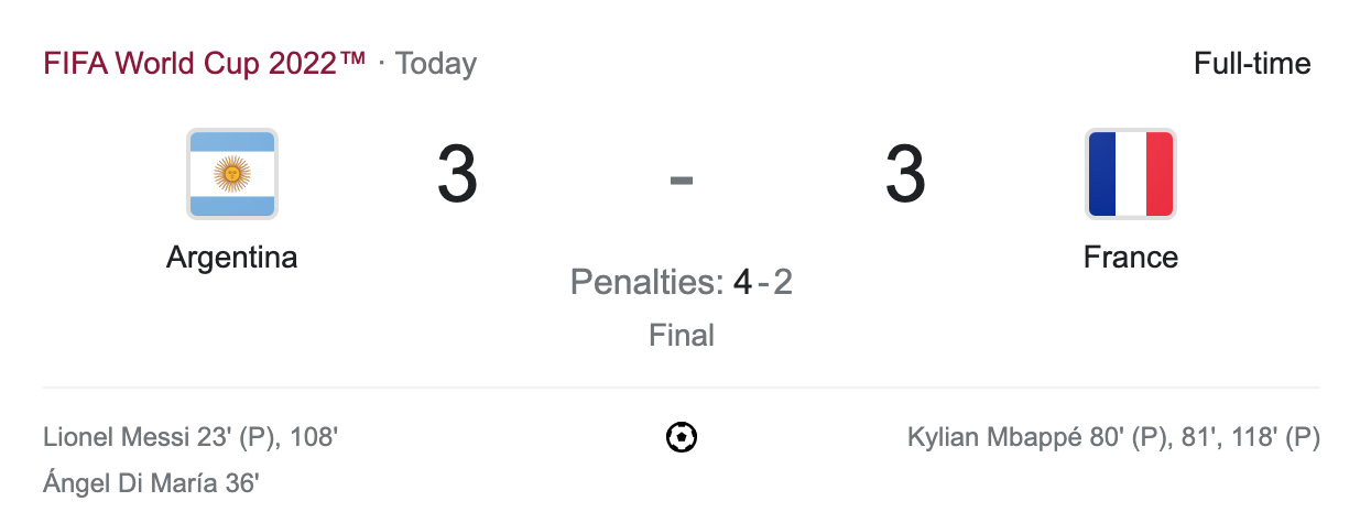 Argentina played France in the FIFA World Cup Qatar 2022 Final today. Argentina beat Croatia in the semi-finals to reach the final. France beat Morocco in the semi-finals to advance to the final. This was back-to-back finals appearances for France. France was trying to defend their title as FIFA World Cup champions after they won Russia 2018. The winner of this game would be the winner of Qatar 2022. Argentina opened the scoring in the 23′ minute. They scored on a penalty. Argentina would add to their lead in the 36′ minute. At halftime the score was 2-0 Argentina. The score would stay that way until France scored on a penalty in the 80′ minute. France would tie the game one minute later. The score was tied at 2-2 after full time. In extra time Argentina would retake the lead in the 108′ minute. France would tie the game back up in the 118′ minute. After extra time the score was 3-3. Argentina would defeat France in penalties 4-2. The final score was 3-3 with Argentina winning on penalties.