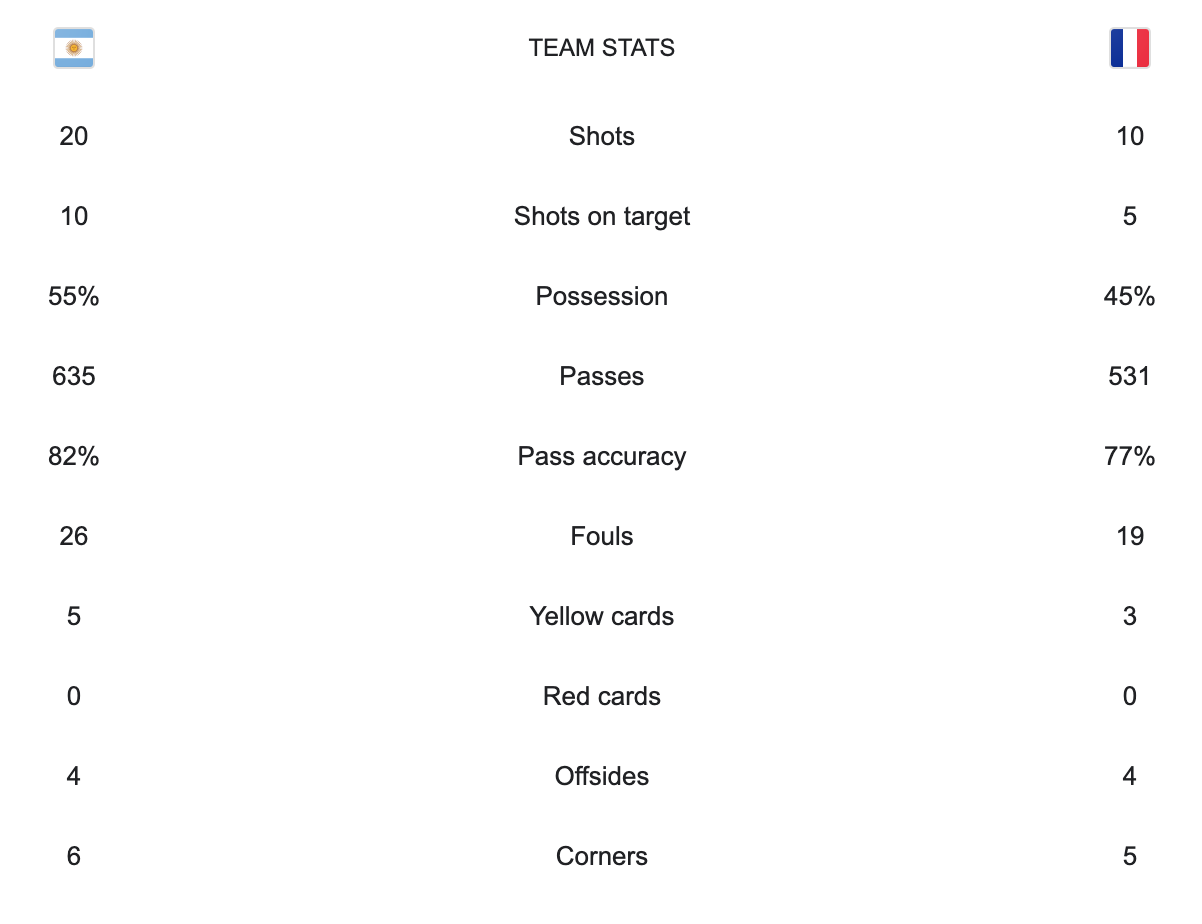 Argentina outshot France 2 to 1. Possession was pretty close. Argentina was in control for the majority of the game. It looked like they were going to coast to a win. France had other plans. Argentina ultimately won but France did not make it easy. It was insane to watch Argentina lose their lead in the span of a minute. The goal in the 80′ minute completely changed the game. France had a lot of momentum. Despite tying the game twice they could never really get an advantage over Argentina. Kylian Mbappé carried France in this game. From what I saw a lot of the other players on France were not producing quality plays. He got a hat trick which is cool. Unfortunately the effort of one man was not enough to push France to the level they need to be playing at to win.