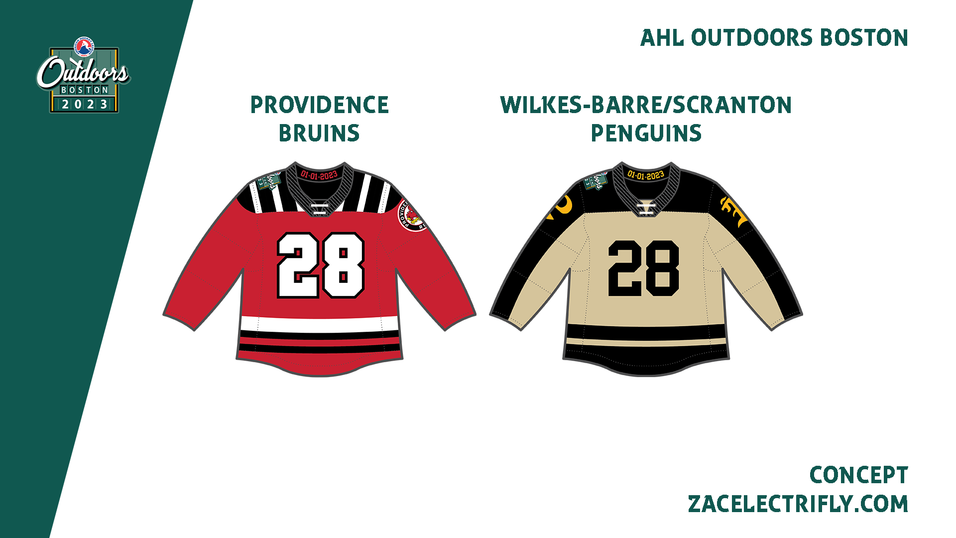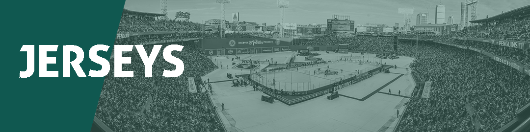 The jerseys are inspired by the Providence Reds and Pittsburgh Hornets respectively. The Providence Bruins jersey is based on the 1955-56 Providence Reds jersey. The Wilkes-Barre/Scranton Penguins jersey is based on the 1950’s Pittsburgh Hornets jersey. Both jerseys have numbers on the front with logos on the sleeves. The event logo is on the shoulders. On the collar is the date of the game.