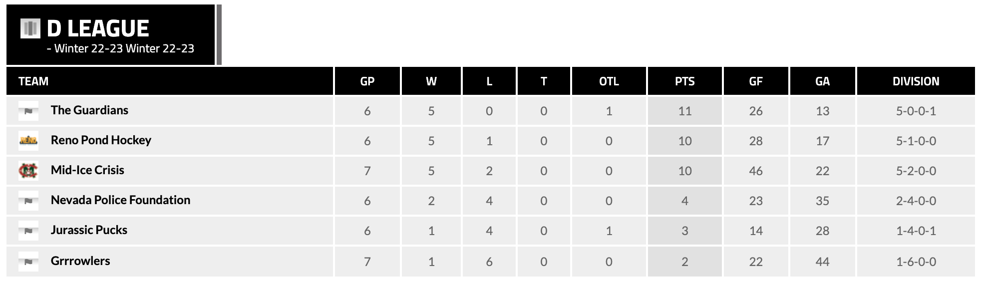 Reno Pond Hockey is in a playoff spot. They only need one win in their remaining four games to secure their playoff spot. If the playoffs started today they would matchup with Mid-Ice Crisis in the Semifinals for the second season in a row. The other Semifinal game would be the Guardians and the Nevada Police Foundation. No D-League team has secured a playoff spot yet. The top three teams are one win away though. No D-League team has been eliminated from playoff contention yet. There is only one win separating the bottom three teams. The last playoff spot is up for grabs and could come down to the final games of the regular season.